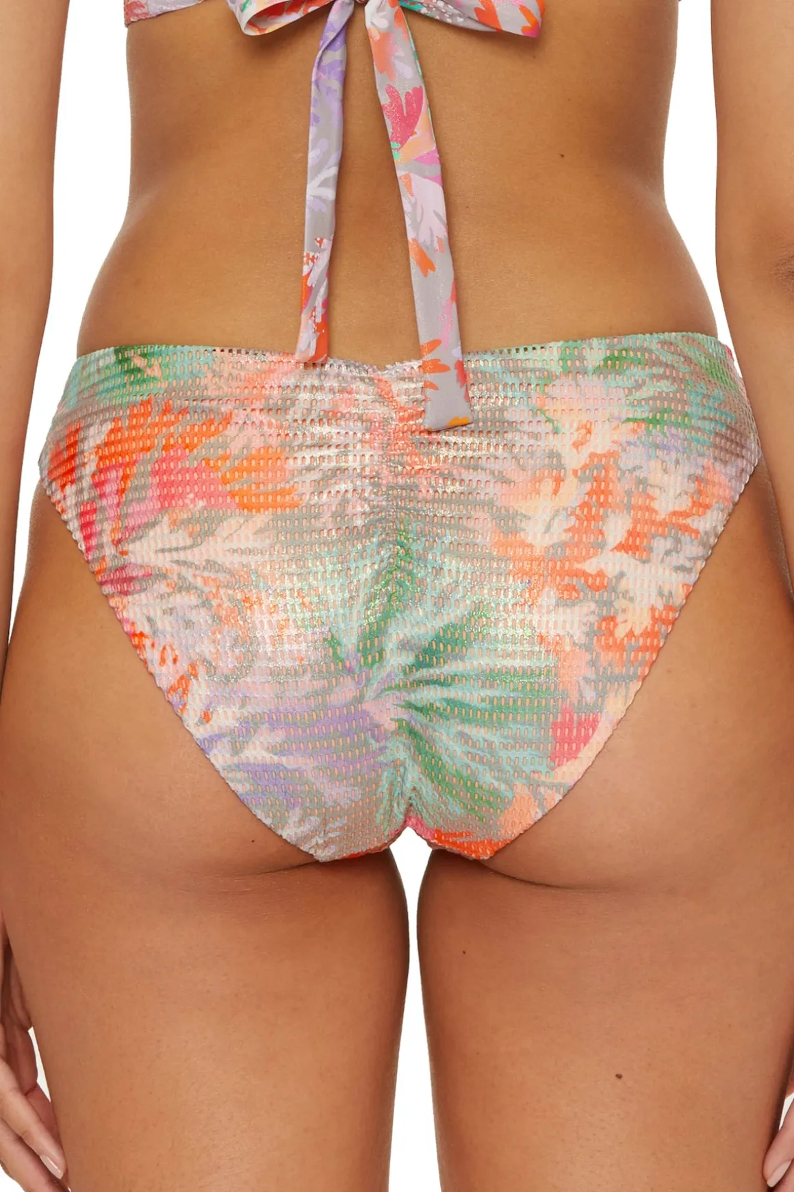 Adela bikini bottom features shimmery fishnet overlayand offers moderate coverage and a ruched back.