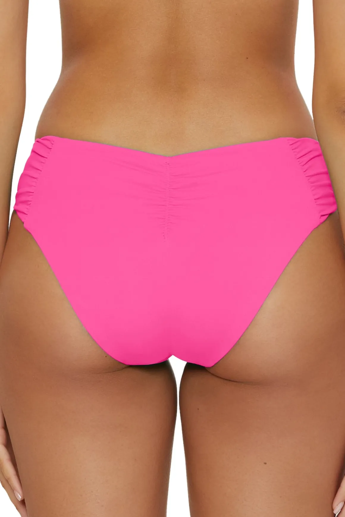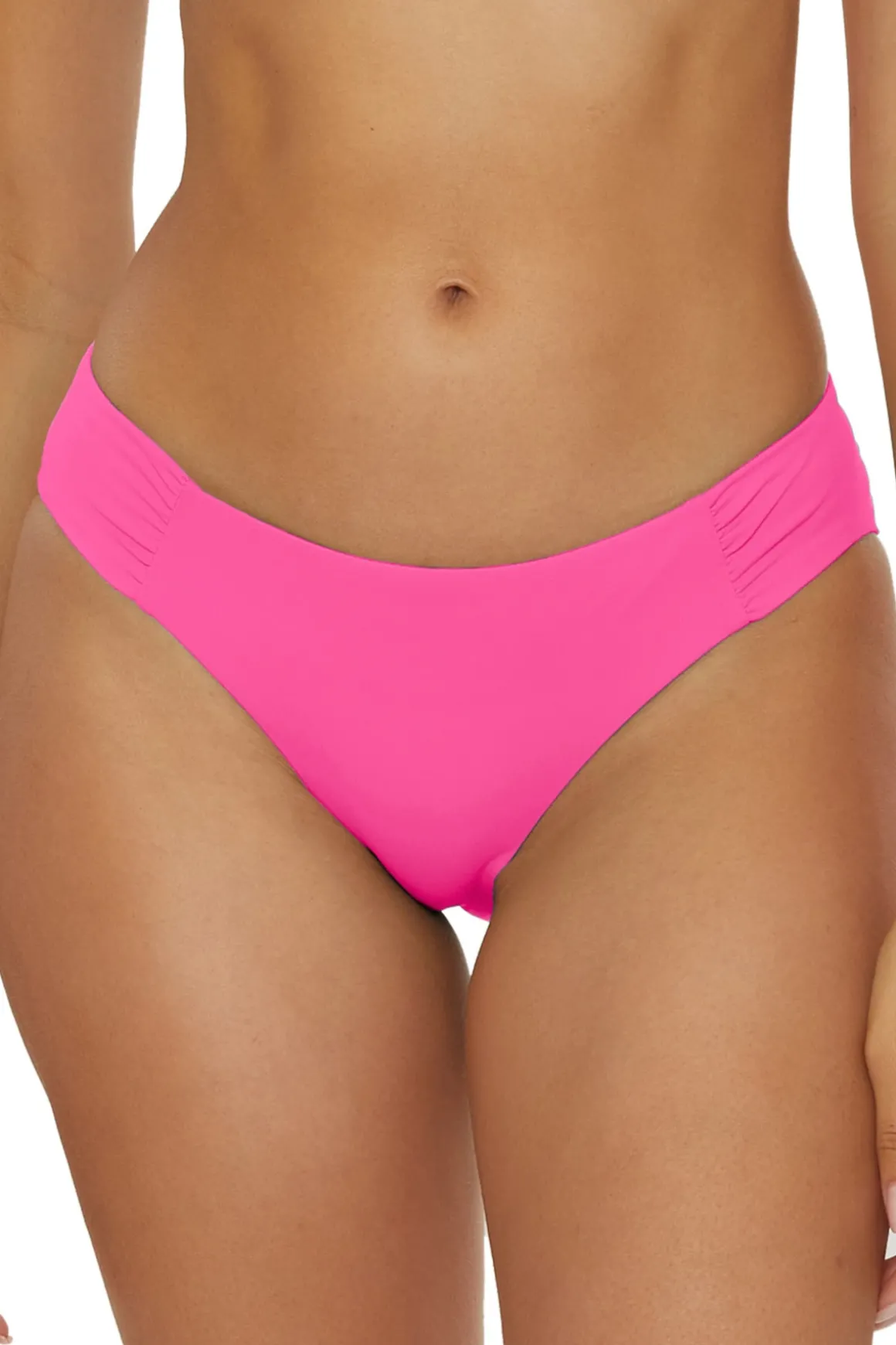 Adela bikini bottom features shirred sides and offers moderate coverage.