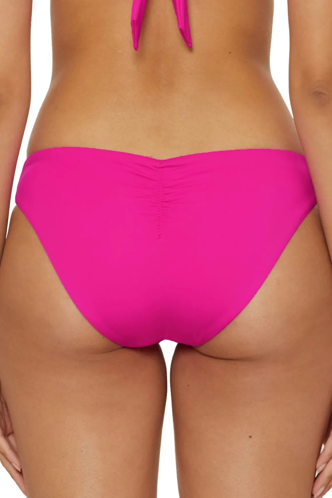 Adela hipster bikini bottom features a cinch back and moderate coverage.