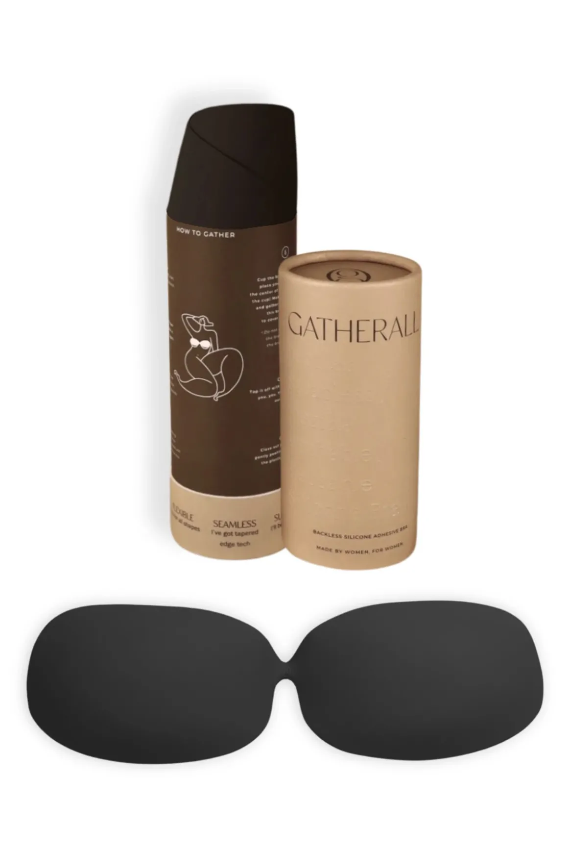 Gatherall Bra is a reusable, washable adhesive silicone bra that provides strapless, backless, and wireless support with flexible comfort.