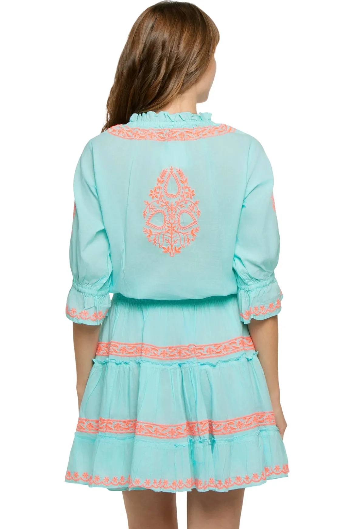 Amar mini dress features floral embroidery accents, v-neckline with tassel drop details, 3/4 length sleeves with ruffle cuffs, smocked waist with tie and a tiered skirt.
