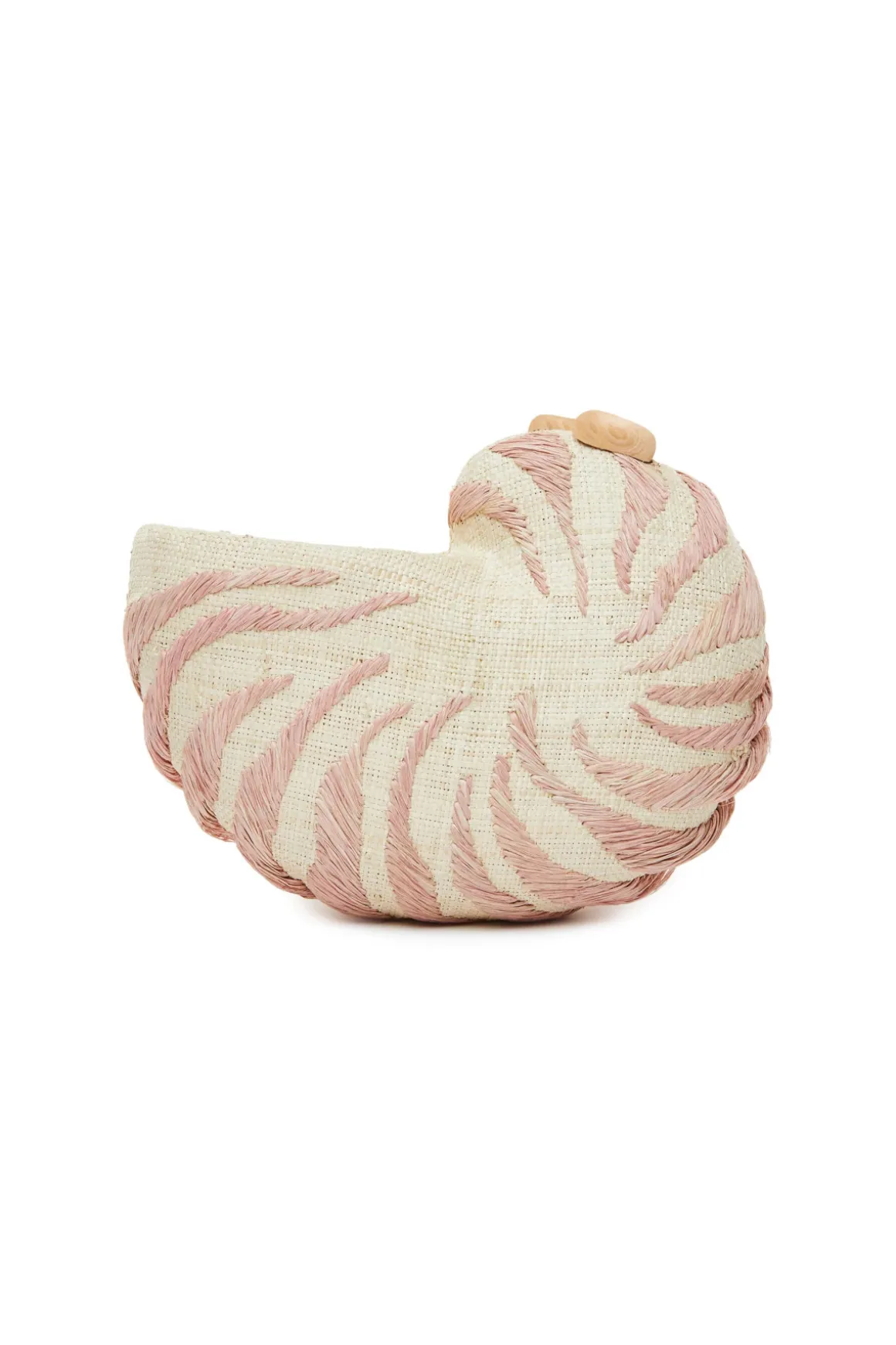 Ann shell clutch features hand-embroidered nautilus shell markings, an optional gold chain, and a hidden magnetic closure.