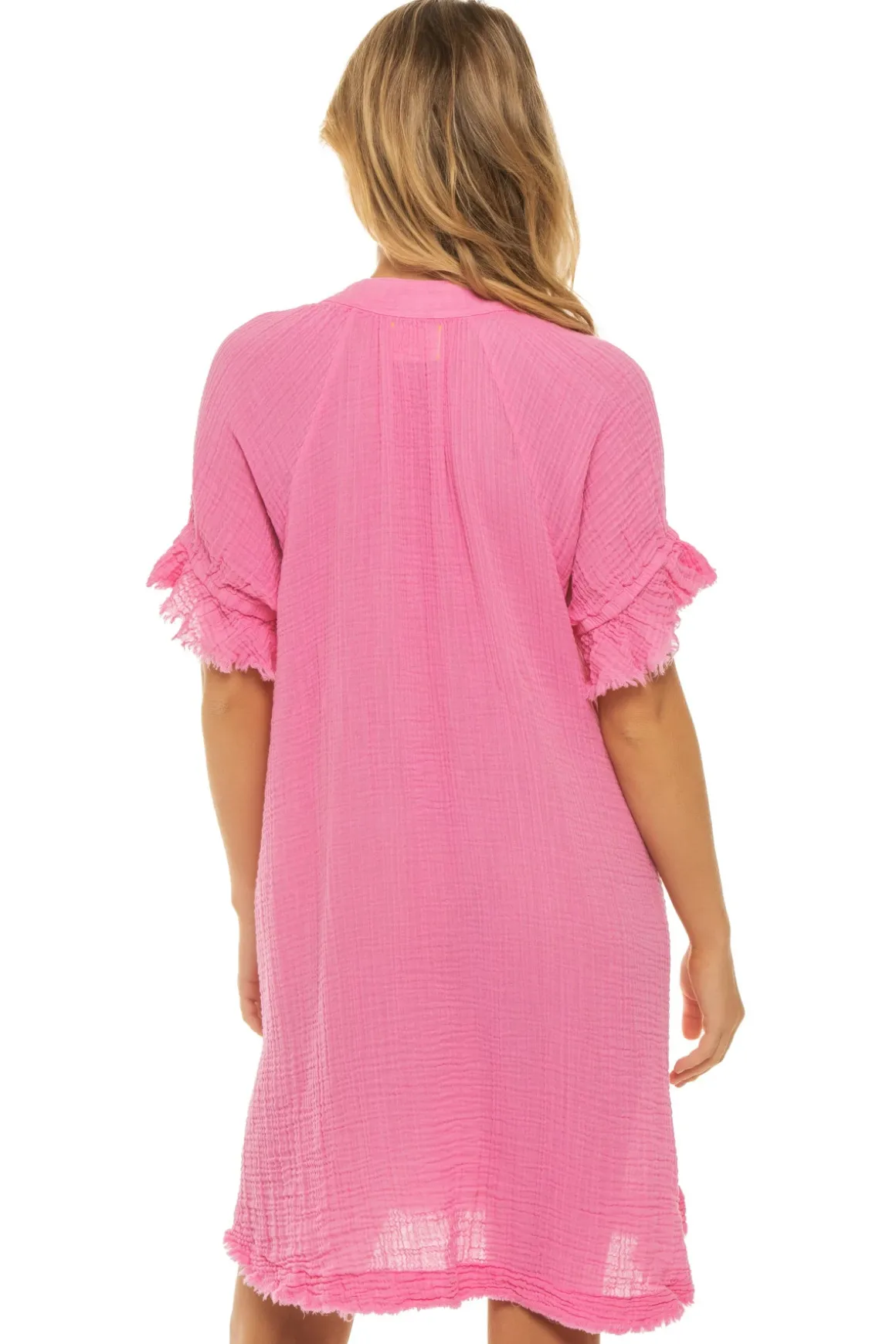 Antibes Tunic features a v-neckline with puff sleeves and a lightly frayed hem.