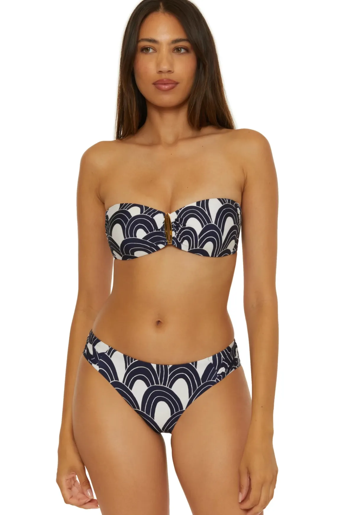 Bikini top features a gold plated hardware accent and offers molded cups and removable halter ties with gold plated beads and tassels.