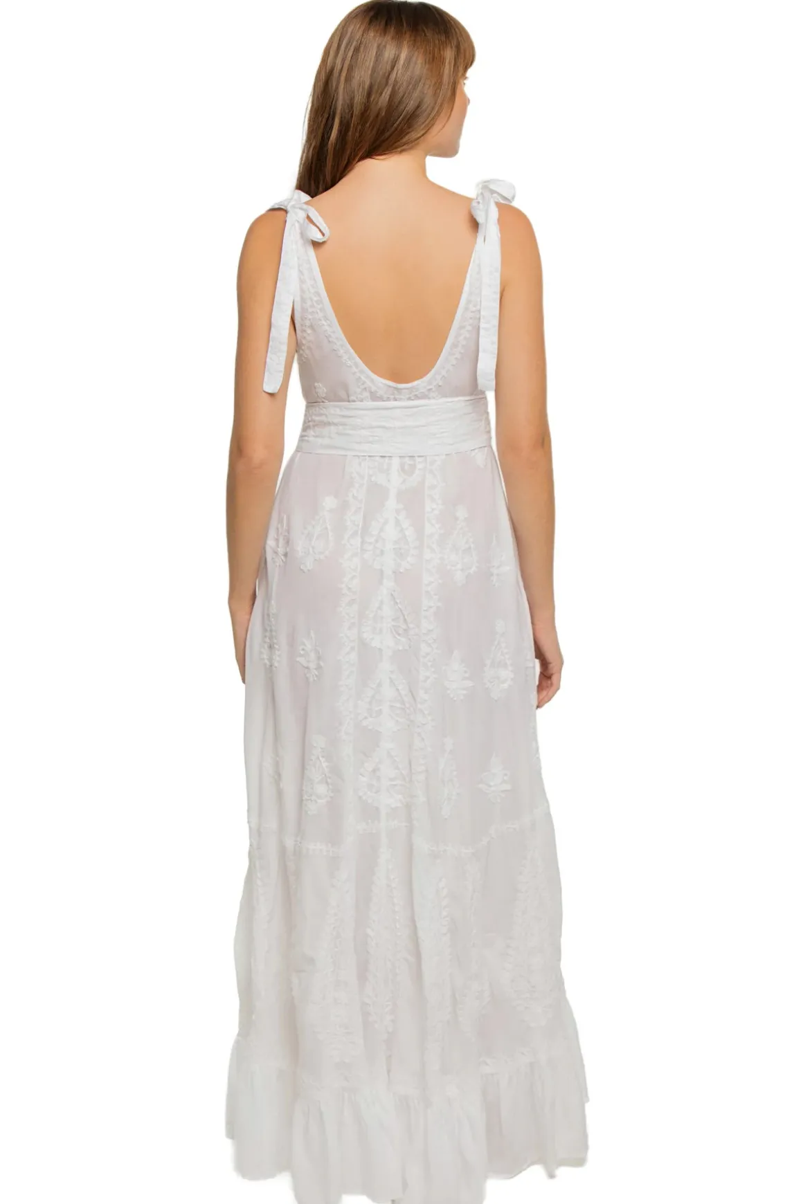 Atzaro maxi dress features embroidery accents, removable waist tie with tassel details, and flowy skirt with ruffle hem. Offers adjustable shoulder ties.