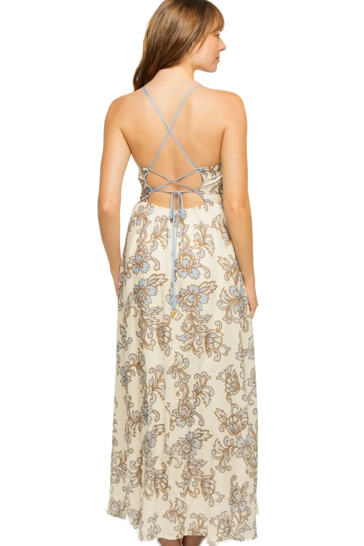 Avalon maxi dress features blue and brown floral print, pockets, and a lace-up back.