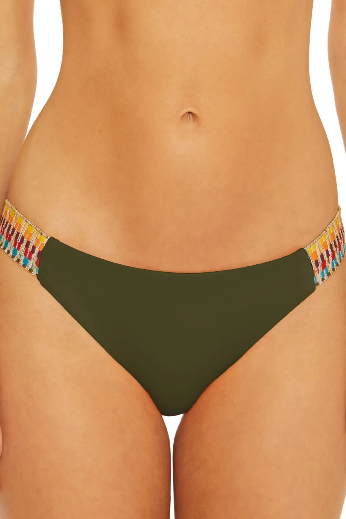 Avery hipster bikini bottom features multi-color basket weave trim and offers moderate coverage.