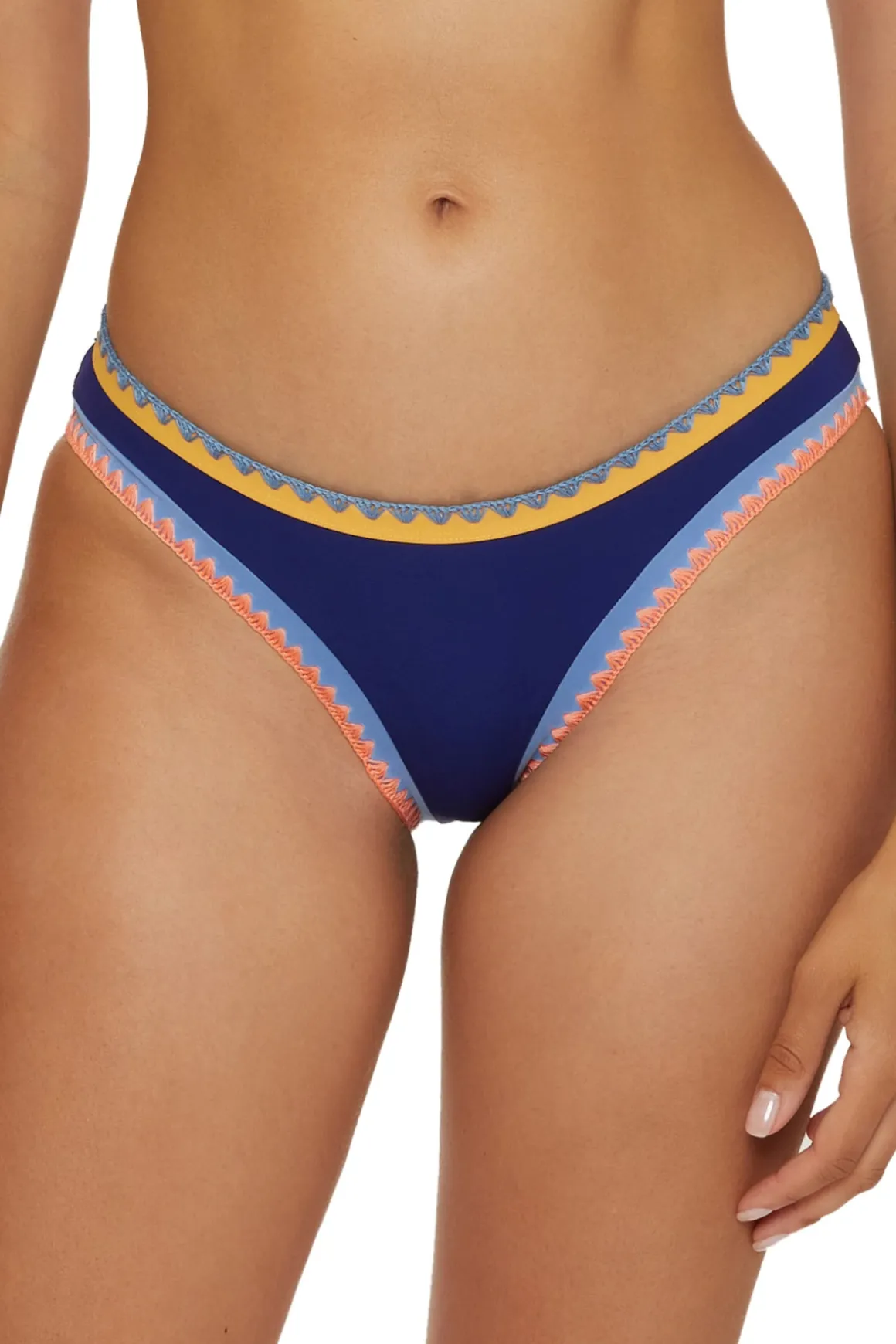Avila hipster bikini bottom features color block banding and contrast shell stitching. Offers moderate bottom coverage.