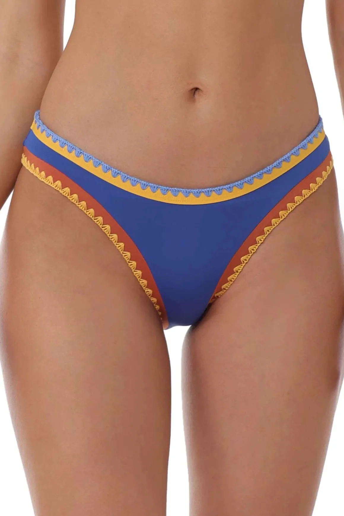 Avila hipster bikini bottom features color block banding and contrast shell stitching. Offers moderate bottom coverage.