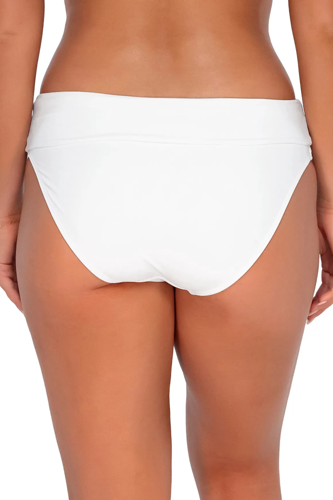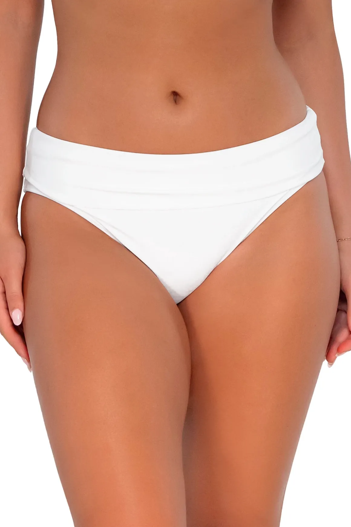 Banded foldover high waist bikini bottom features a wide elastic waist band that can be folded over for less coverage or left extended for full coverage.