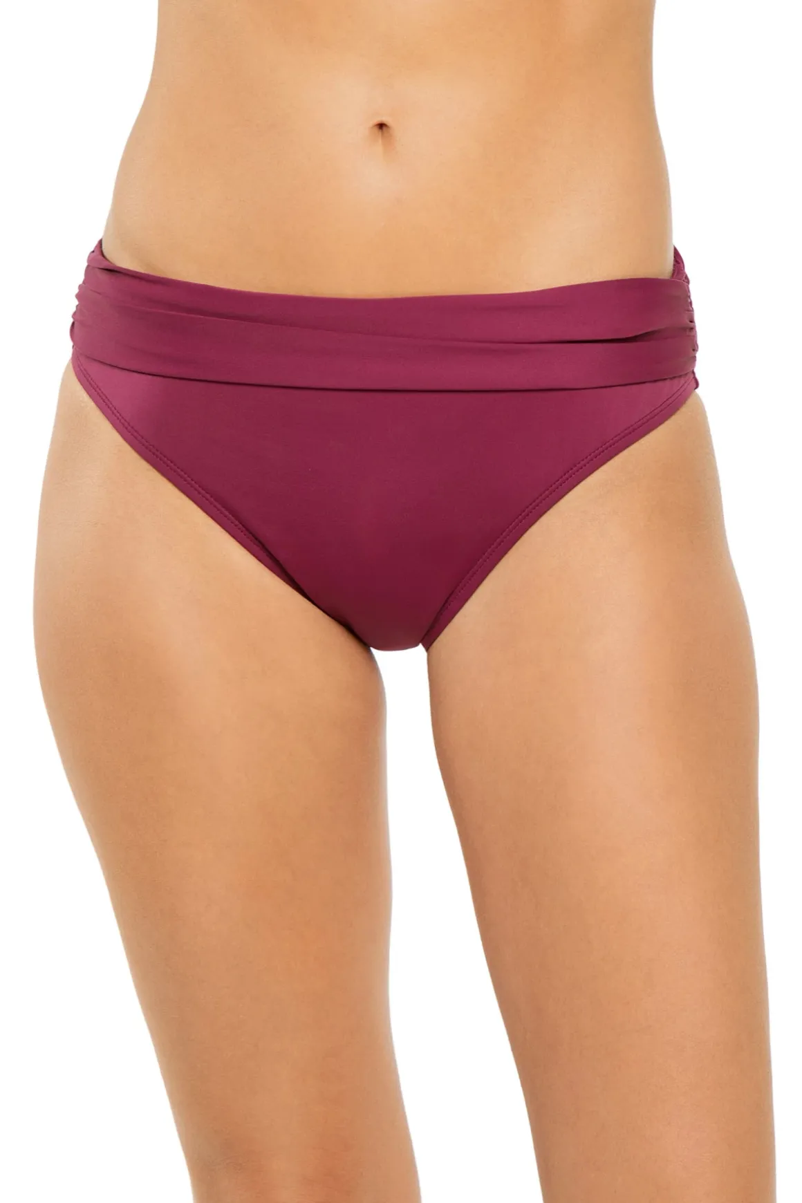 Hipster bikini bottom features a shirred band and offers moderate bottom coverage.