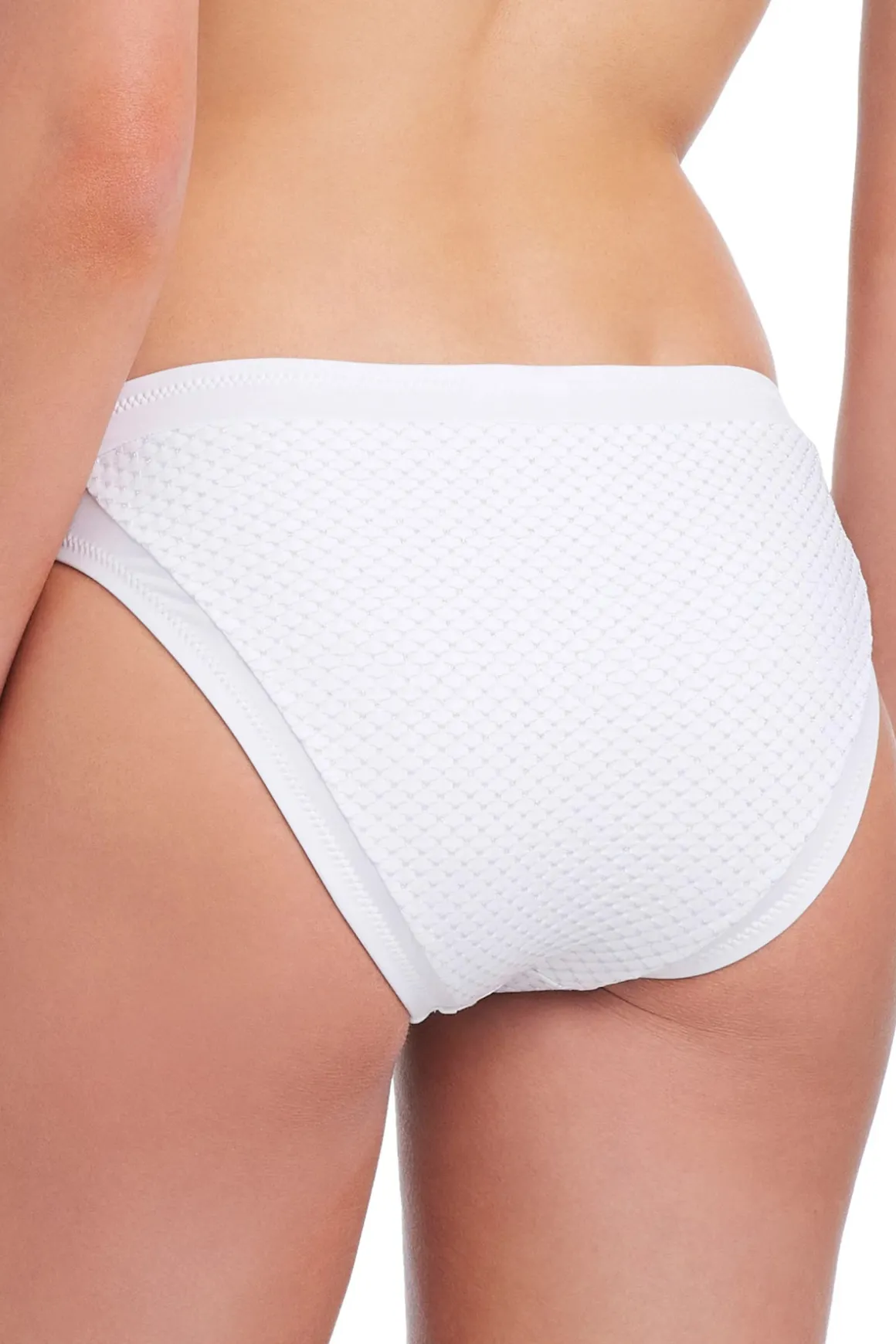 Bikini bottom features textured shimmer fabric, a mid-rise banded waistband, and moderate coverage.
