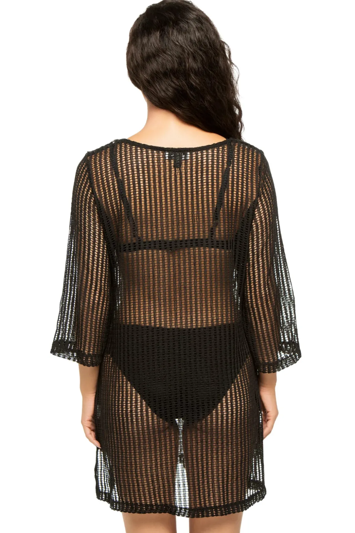 Bora Bora tunic features crochet knit, scoop neckline, and side slits at the hem.