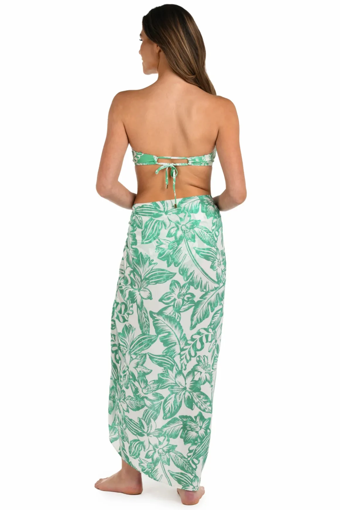 Pareo features a tropical floral design, self tie adorned with tassels, and can be styled multiple ways.
