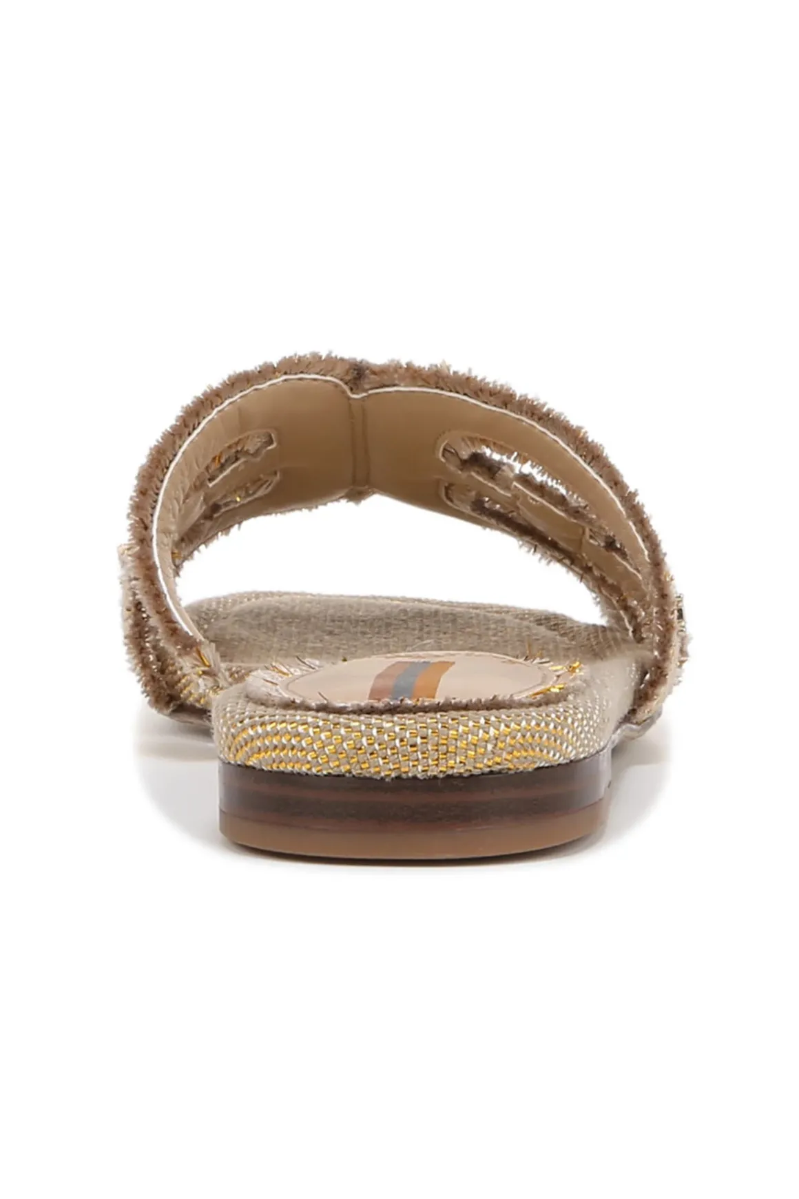 Bay Fray slides feature the brands signature burlap double-E logo strap with a frayed edge.