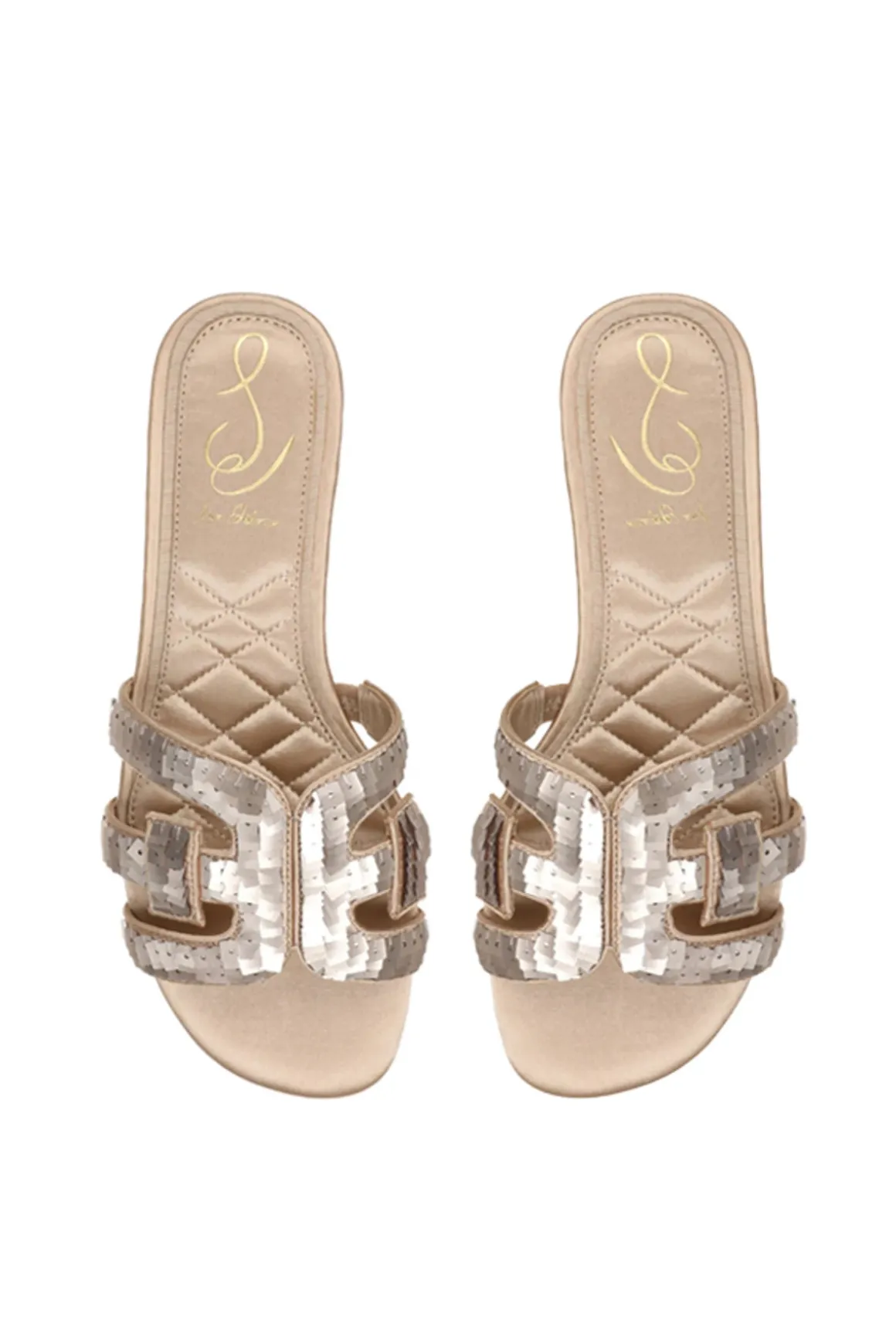 Slides feature glamorous molten gold straps and offers a slightly elevated heel.