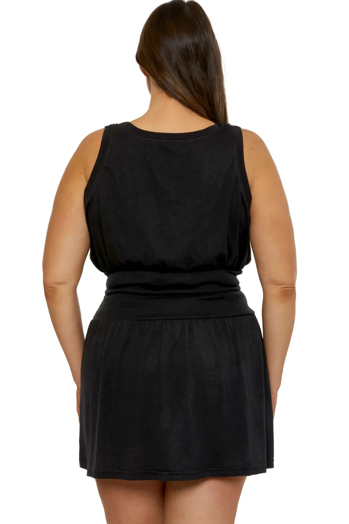 Beach date dress features a round neckline, flexible waist with drawstring, and offers side pockets.