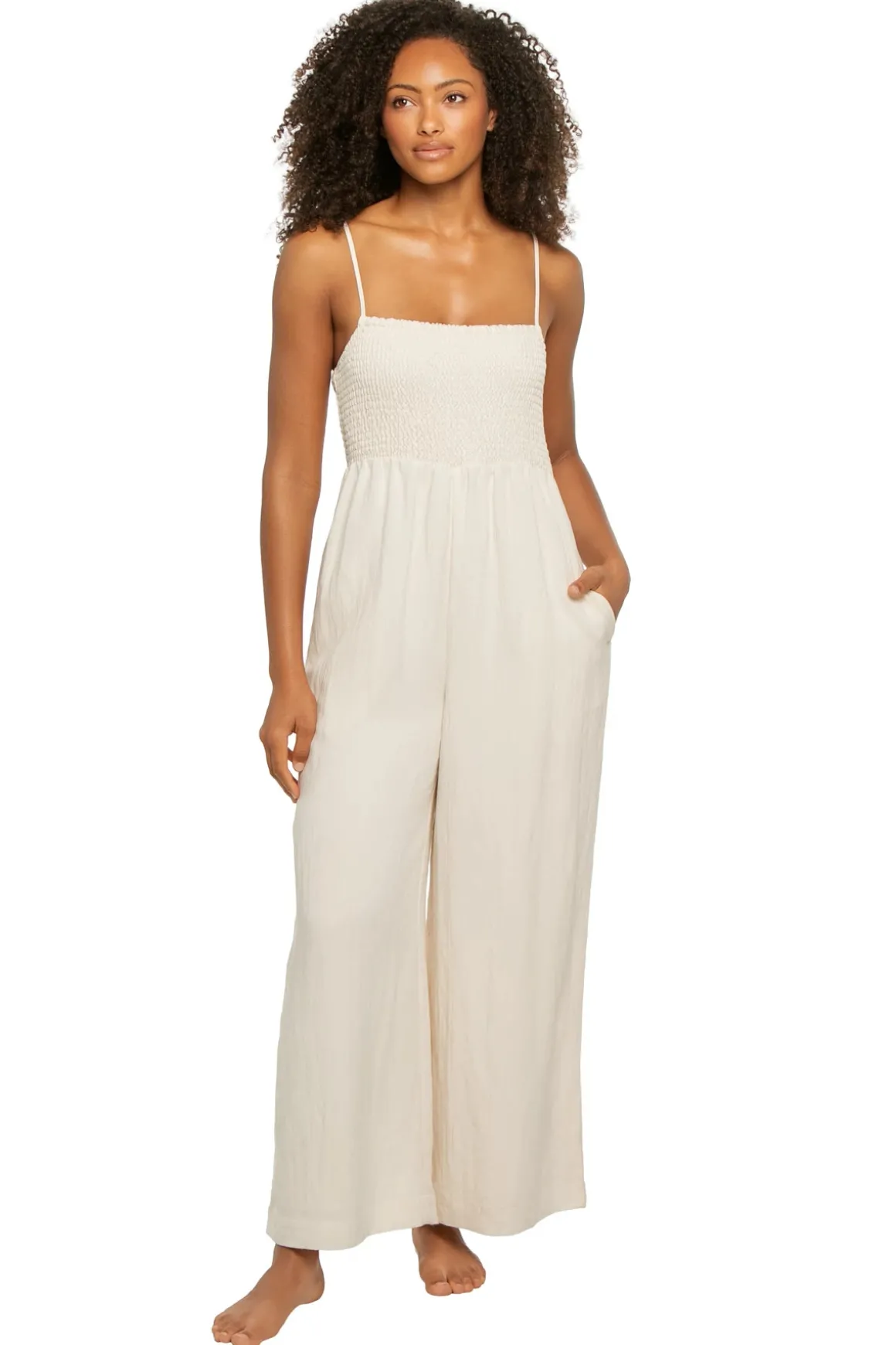 Jumpsuit features a smocked top, adjustable straps, and side seam pockets.