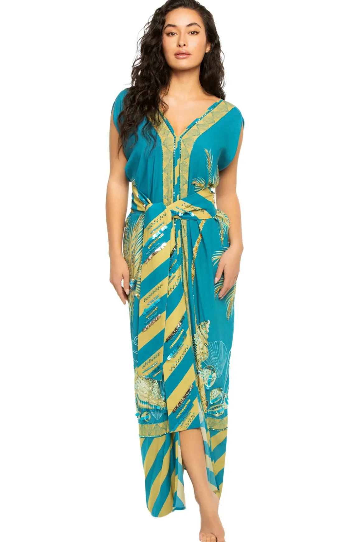 Caftan dress features seashell and palm print embellished with sequins. Offers a removable tie belt.