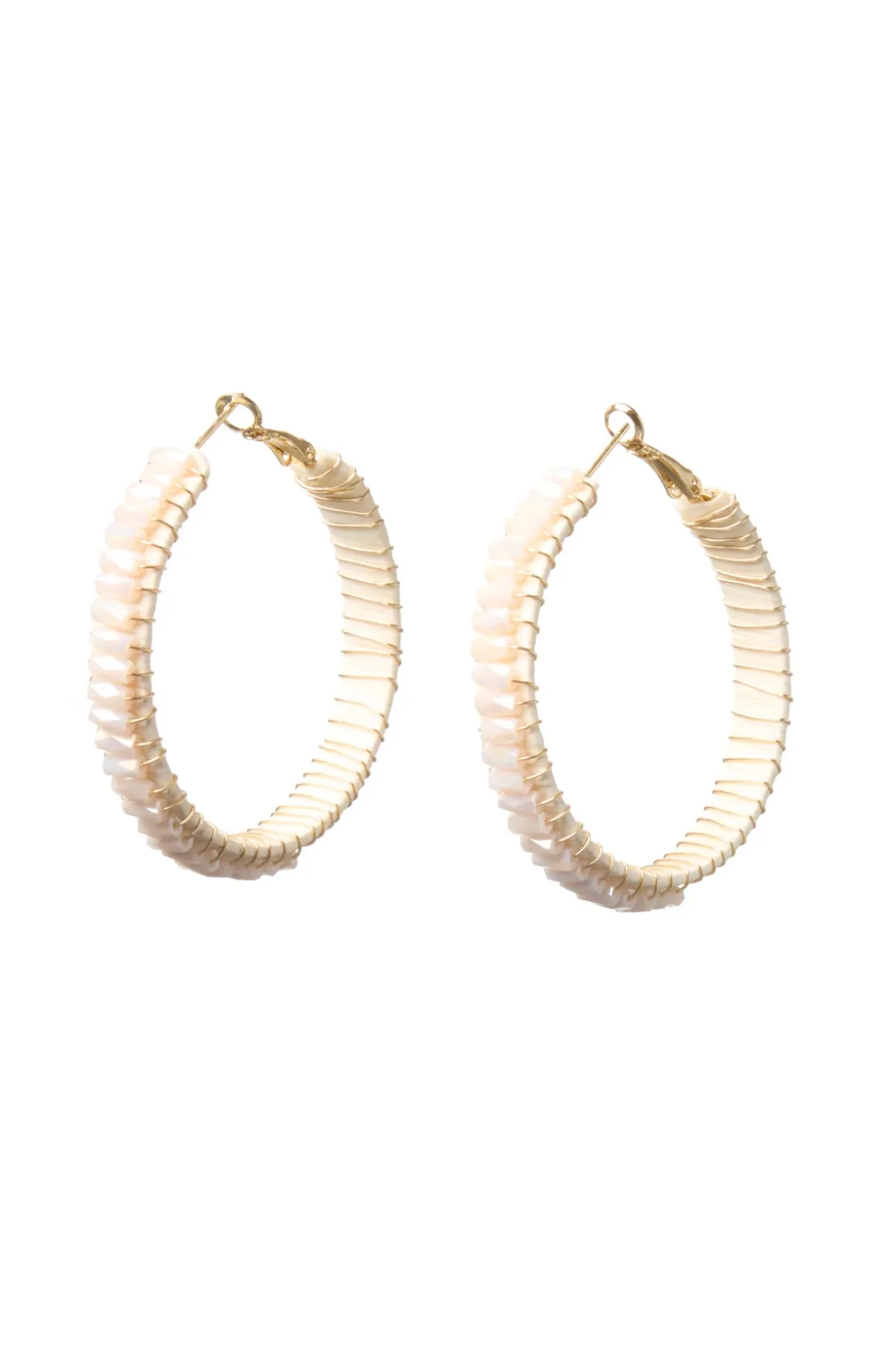 Earrings feature delicate glass beads wrapped around a raffia hoop with lever back closures.