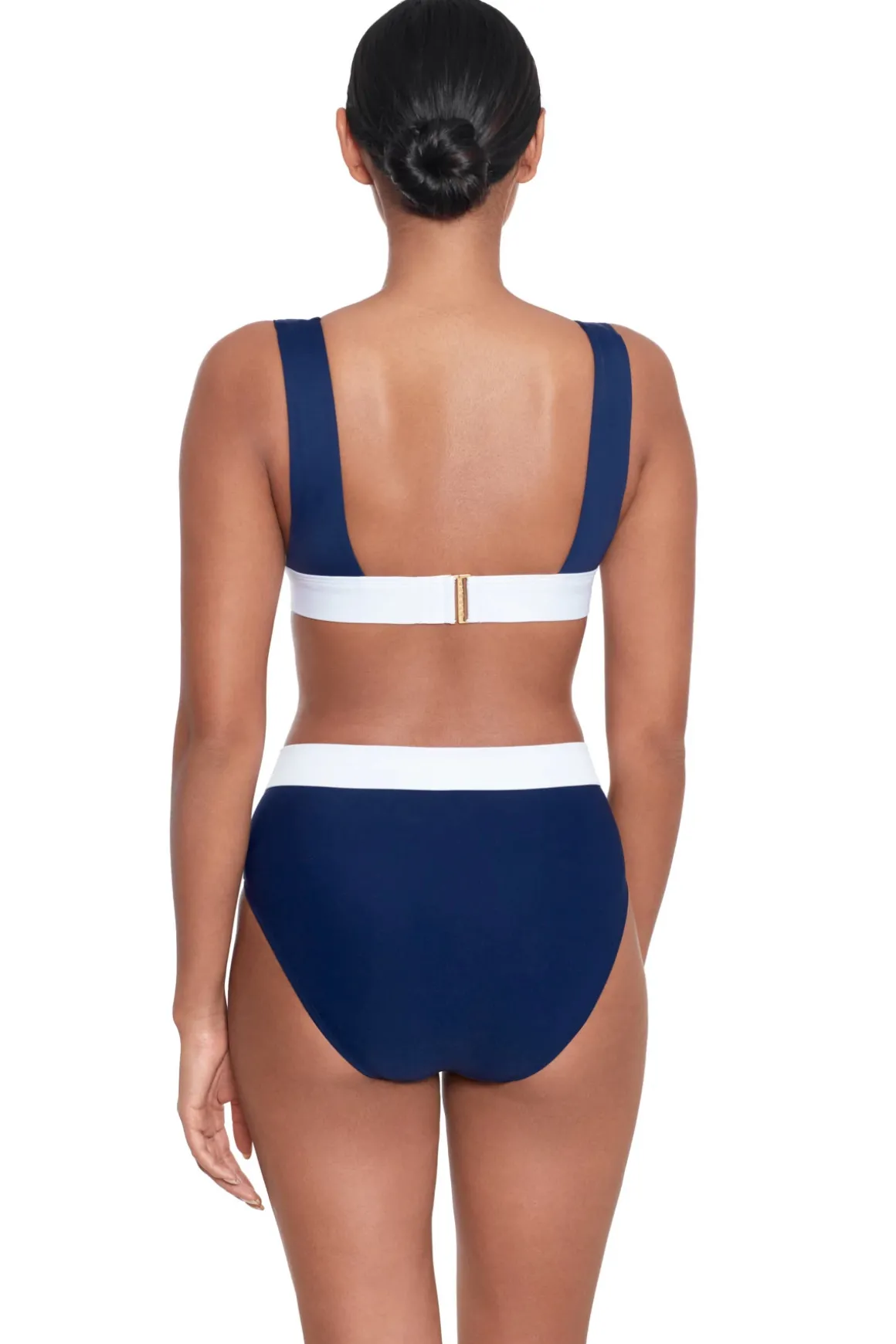 Bel Air colorblock bikini top features a wide under bust band. Offers removable soft cups and an adjustable hook back closure.