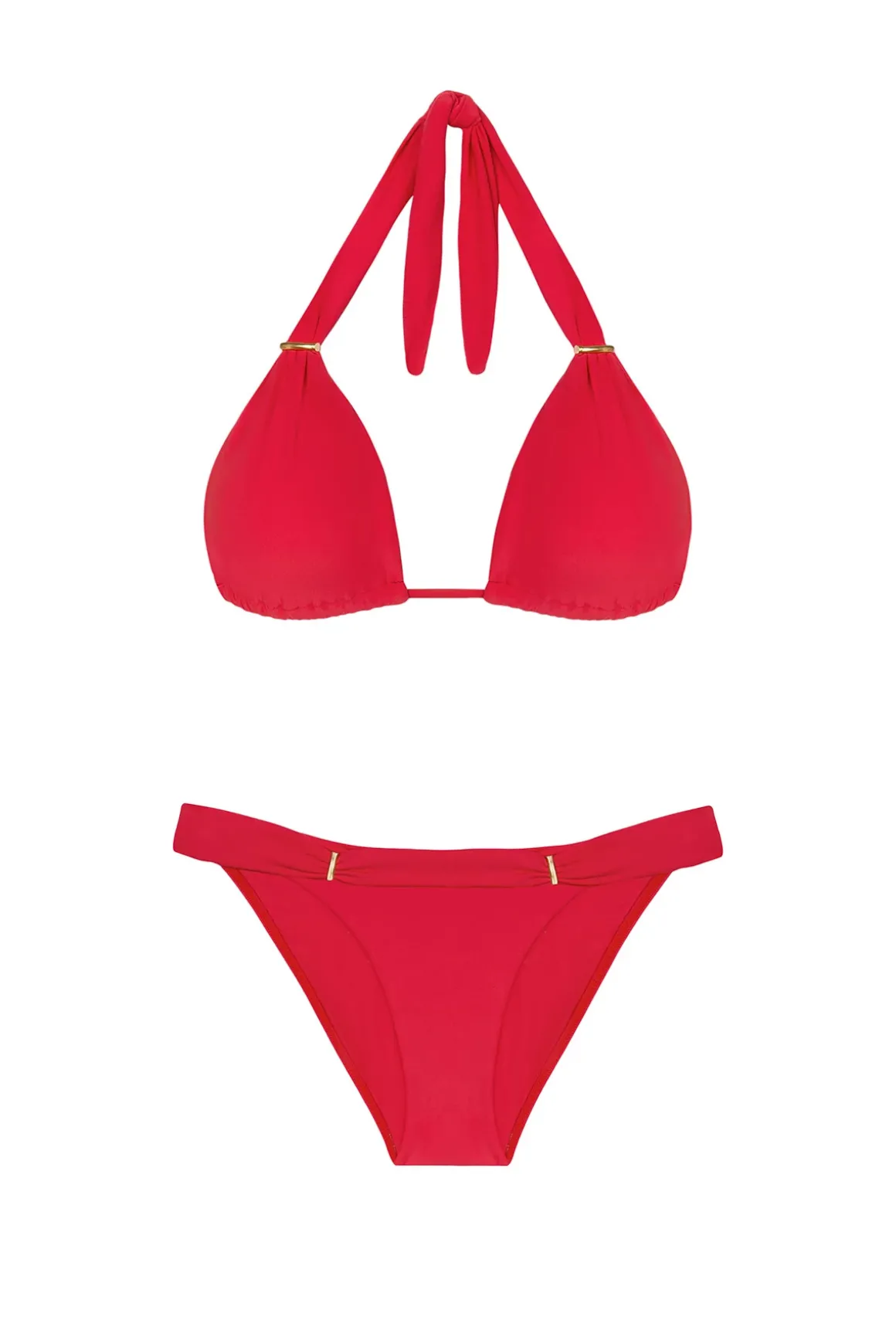 Bia halter bikini top features 24k gold-plated adjustable sliders on the straps, removable soft cups, and adjustable neck and back ties.
