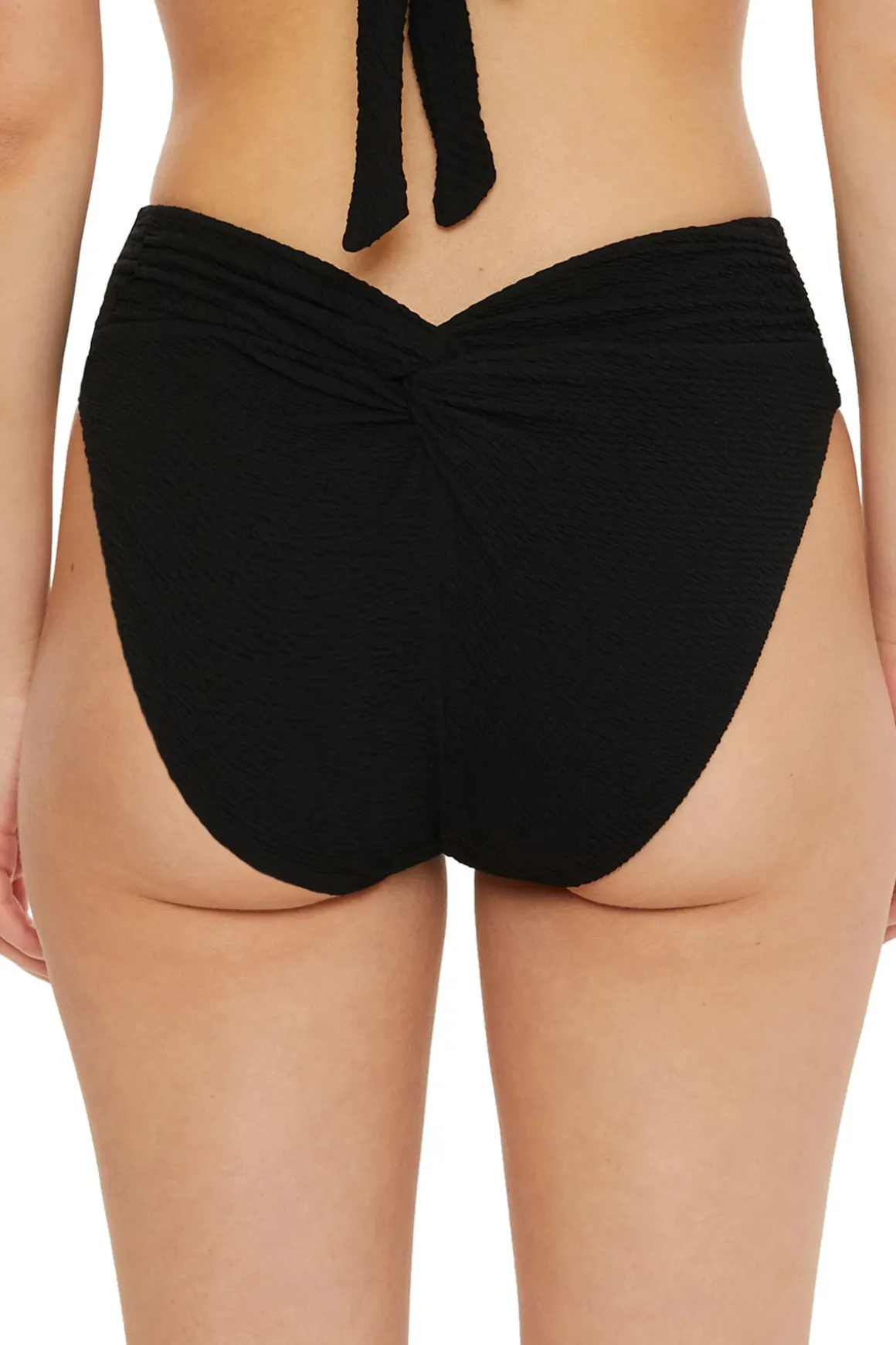 Black sands high waist bikini bottom features a crinkle texture, twist back detail and offers a high leg cut with moderate coverage.