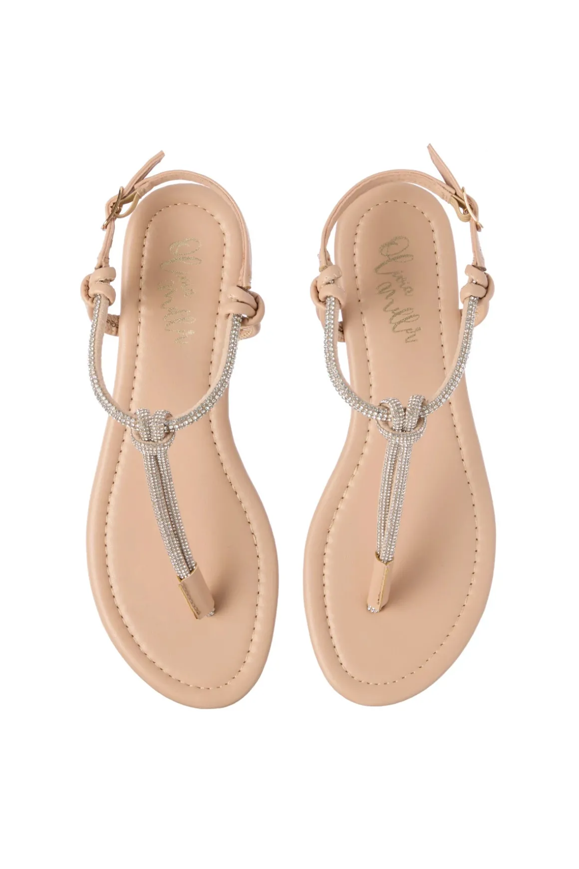 Bling sandals feature a thong strap with rhinestone twist details and a buckle closure.