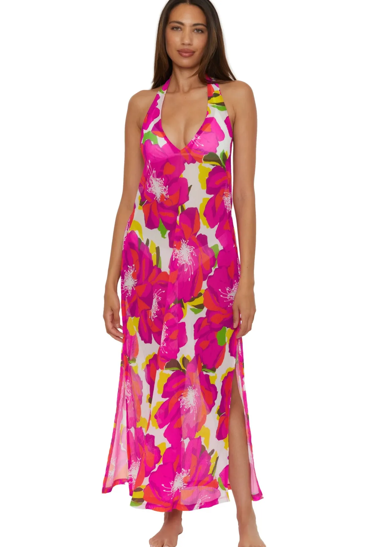 Maxi dress features floral printed mesh fabric, plunging neckline, side slits, and offers adjustable halter ties.