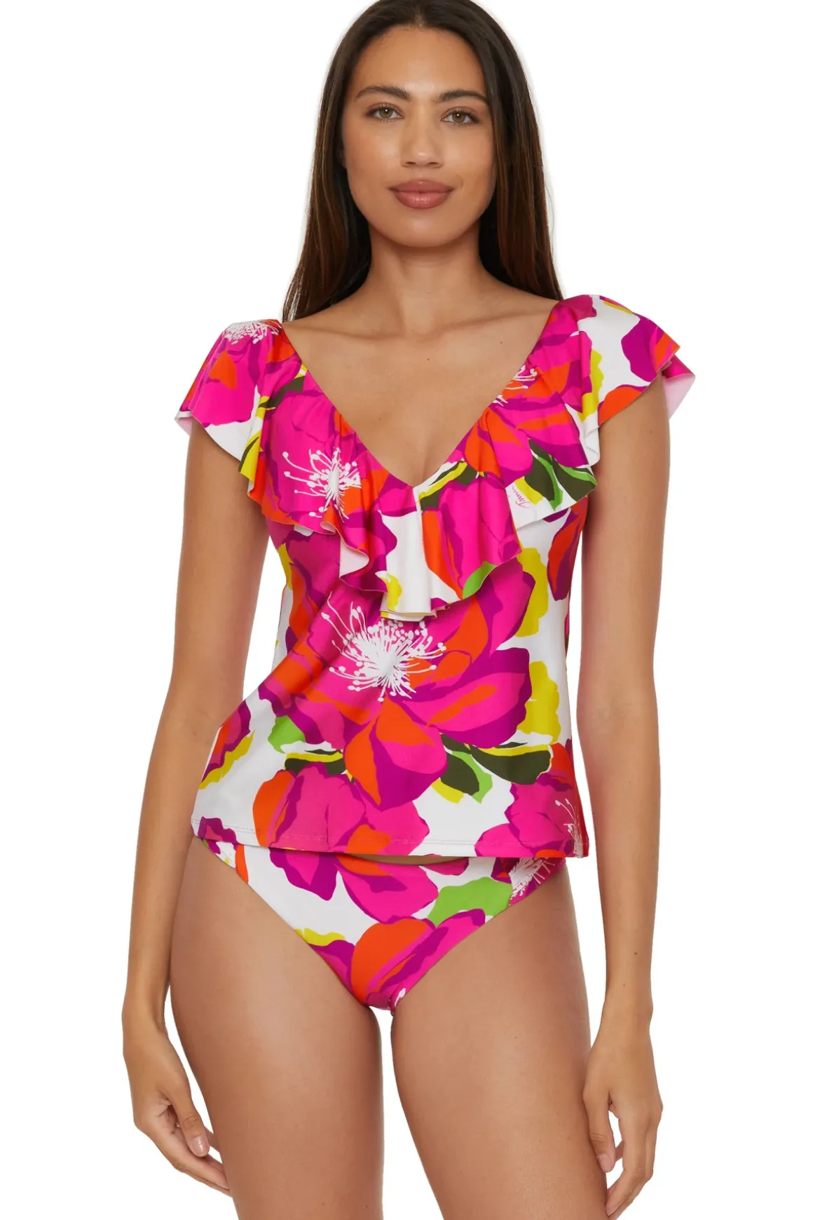 Tankini top features floral print and v-neckline trimmed with flouncy ruffles. Offers shelf bra with removable soft cups.