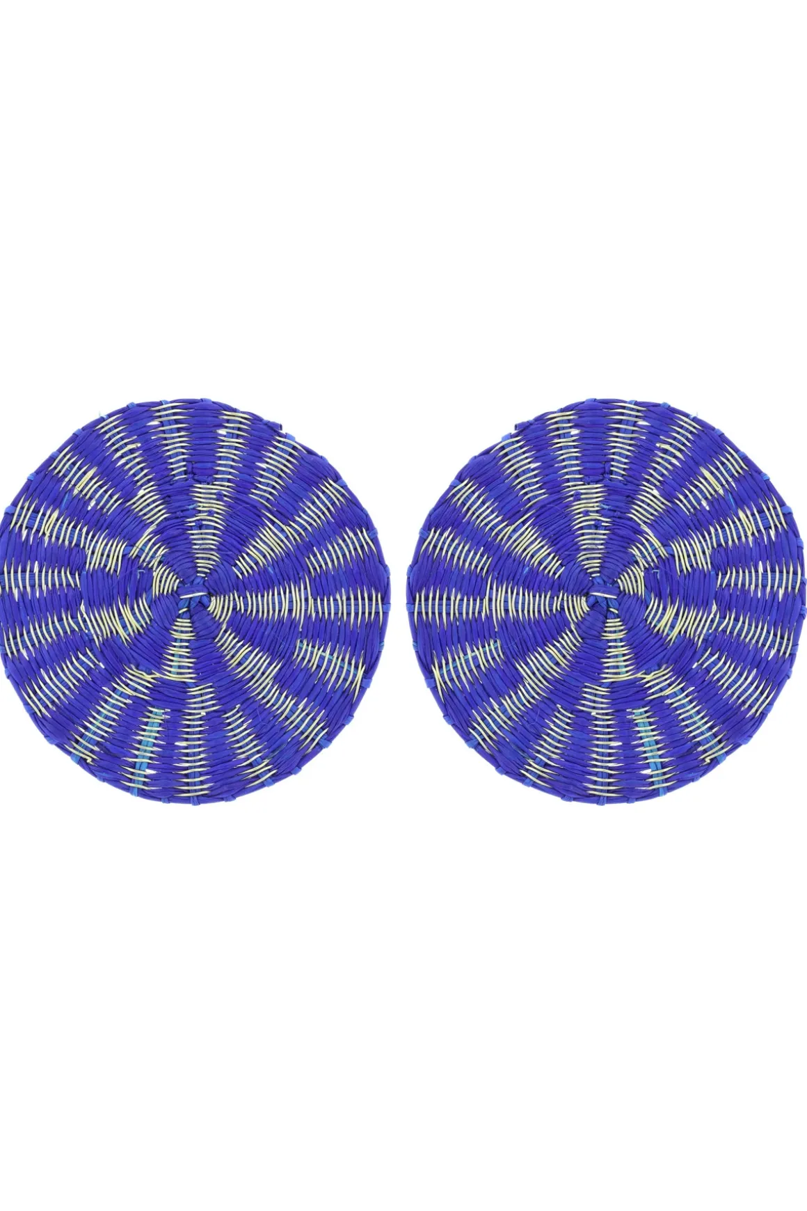Colorful gold plated brass earrings featuring woven raffia circular detail. Clip-on fastener.