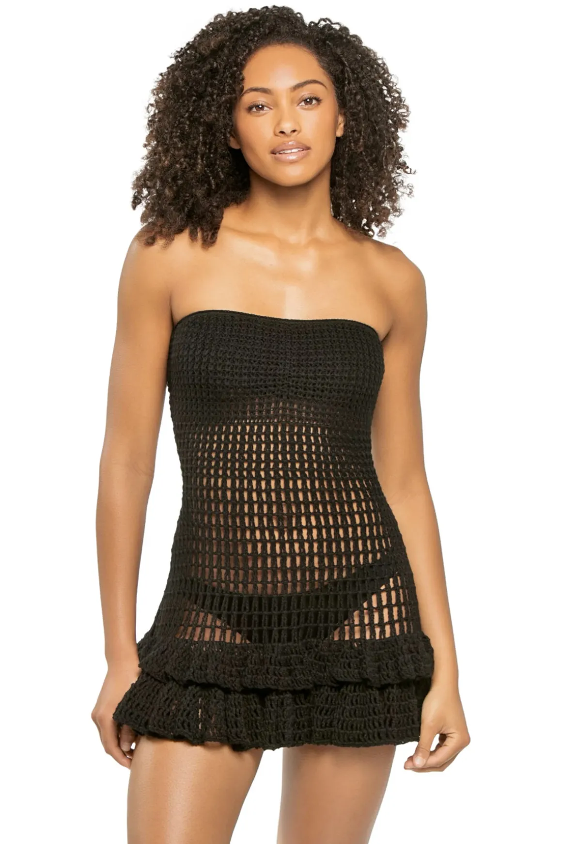 Hand crocheted mini dress features a strapless neckline, ruffle hem and a lace up back.