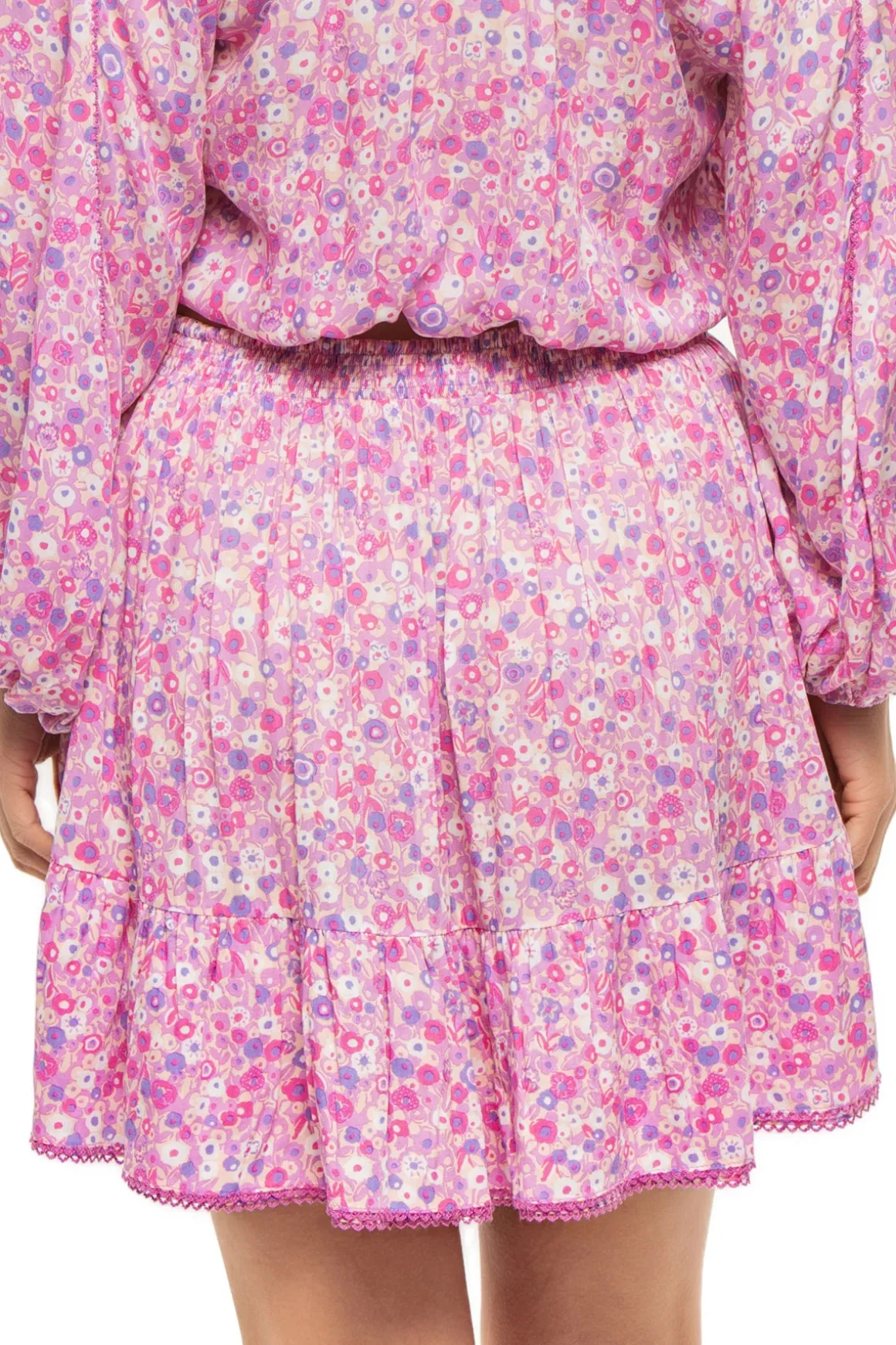 Floral mini skirt features an asymmetrical ruffled hem.