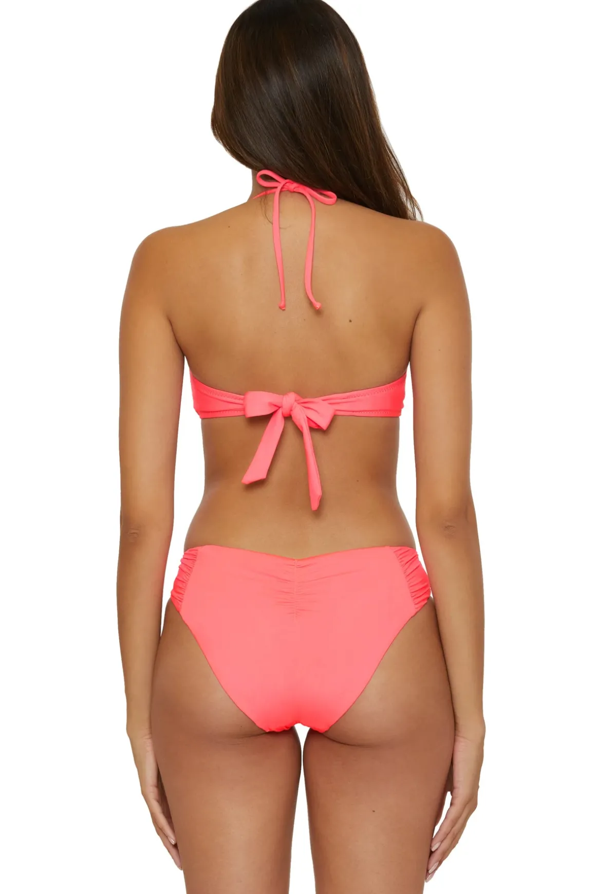 Brinley bikini top features a v-wire front with shirred detailing. Offers removable adjustable halter straps, molded cups, side stays, and a tie back closure.