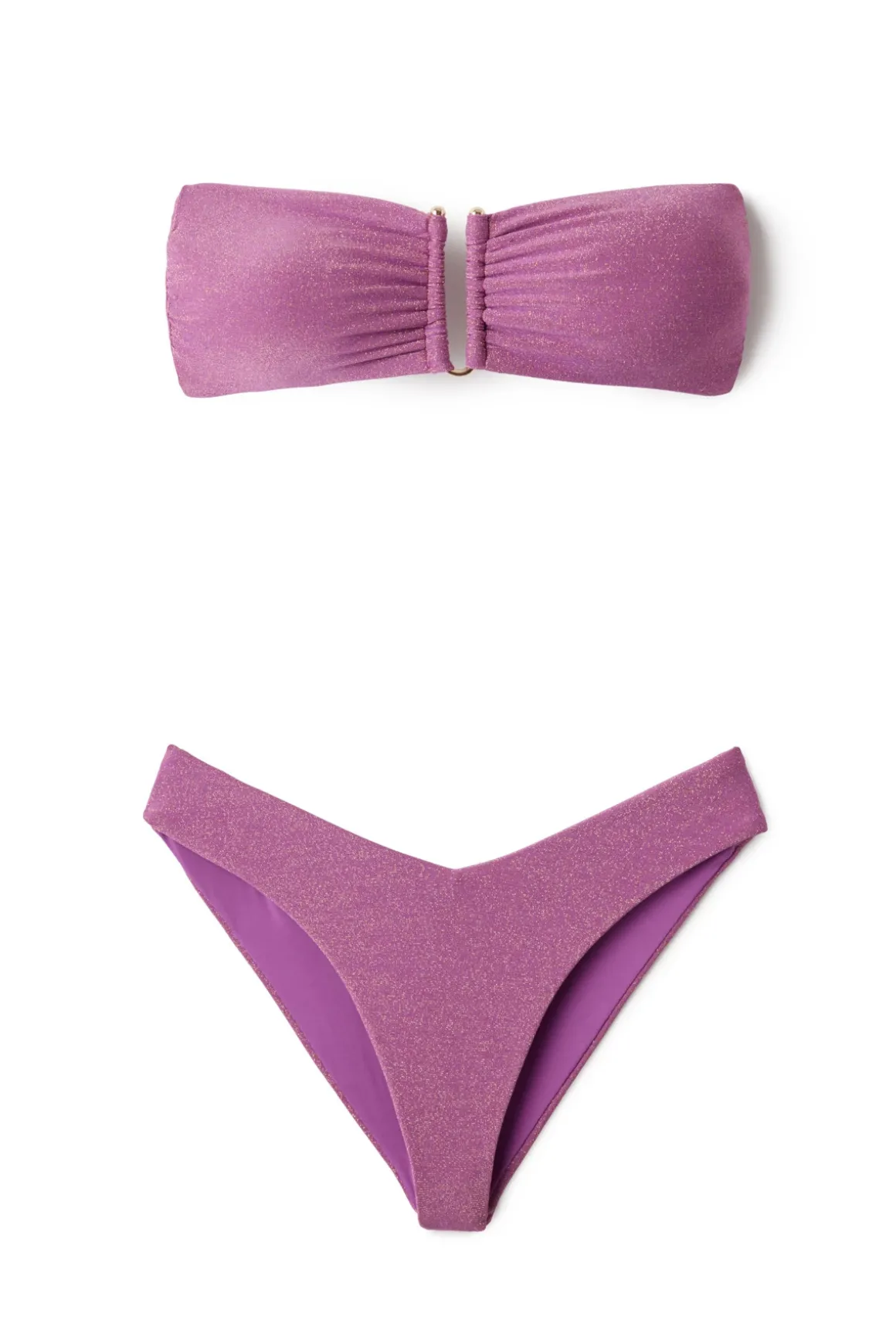 Cabo bikini bottom features a metallic fabric with gold ring accents. Offers adjustable tie sides and minimal coverage.