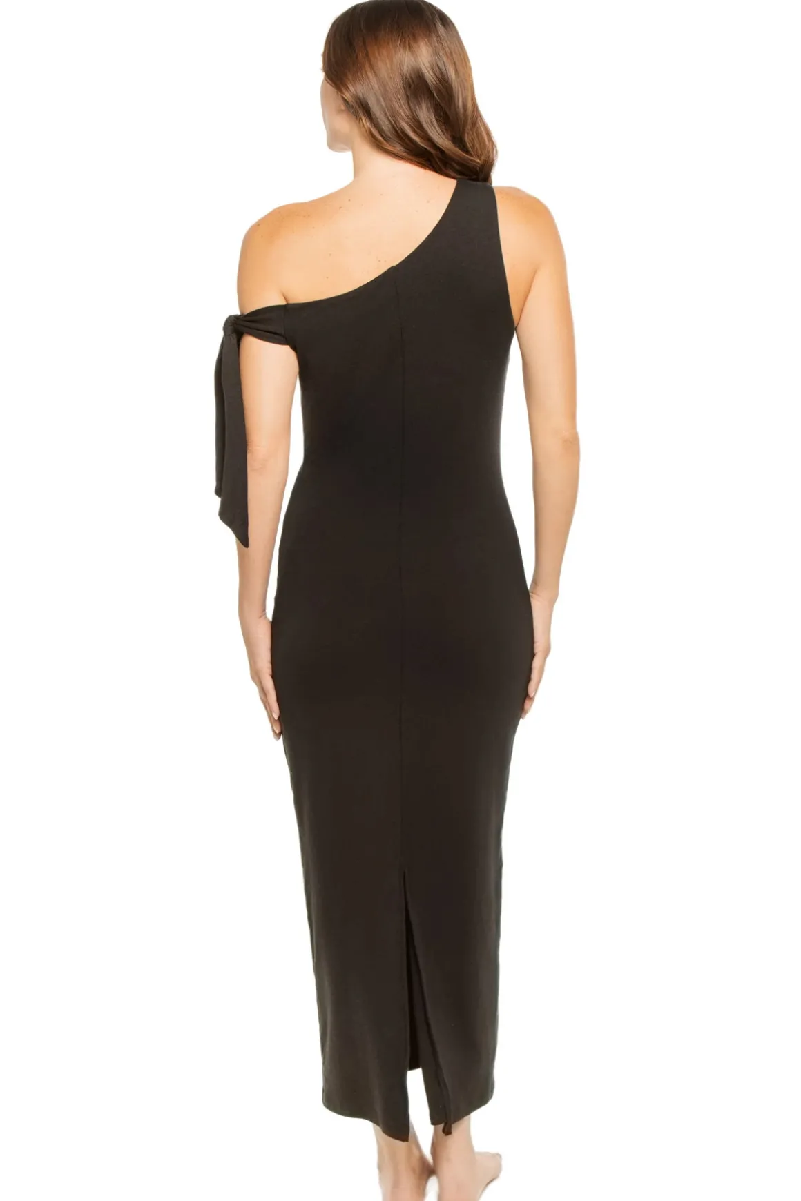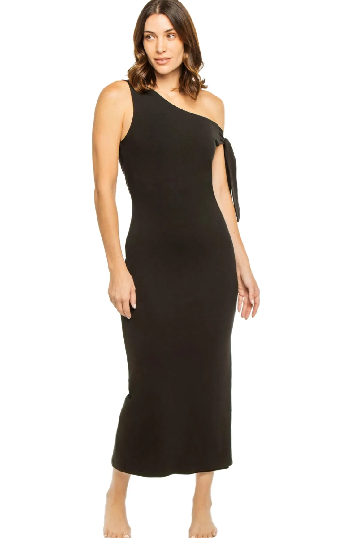 Carlota midi dress features asymmetrical top with an off the shoulder tie.