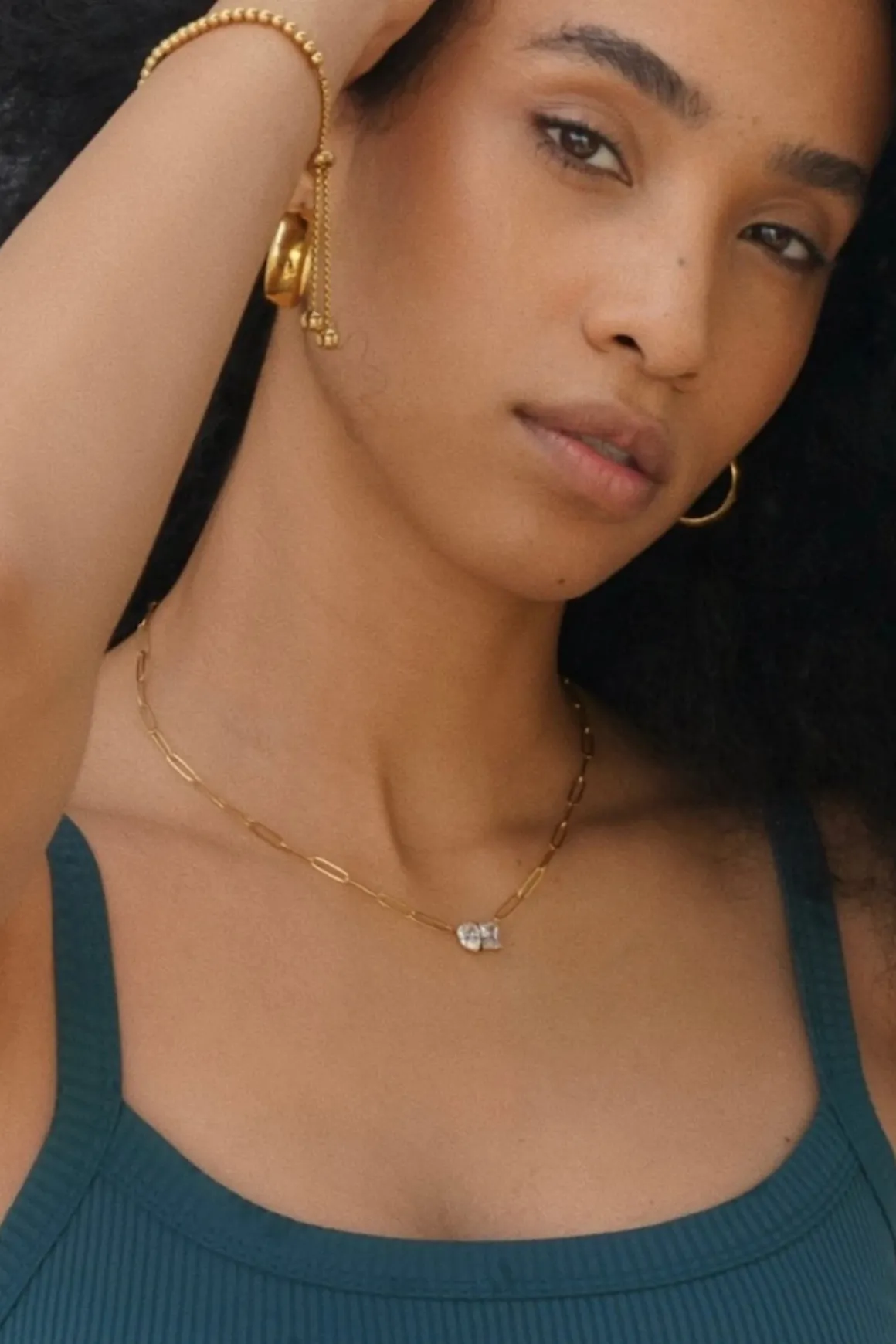 Cecilia necklace is water-resistant, made from gold-plated stainless steel, and features cubic zirconia. Offers a lobster clasp closure.
