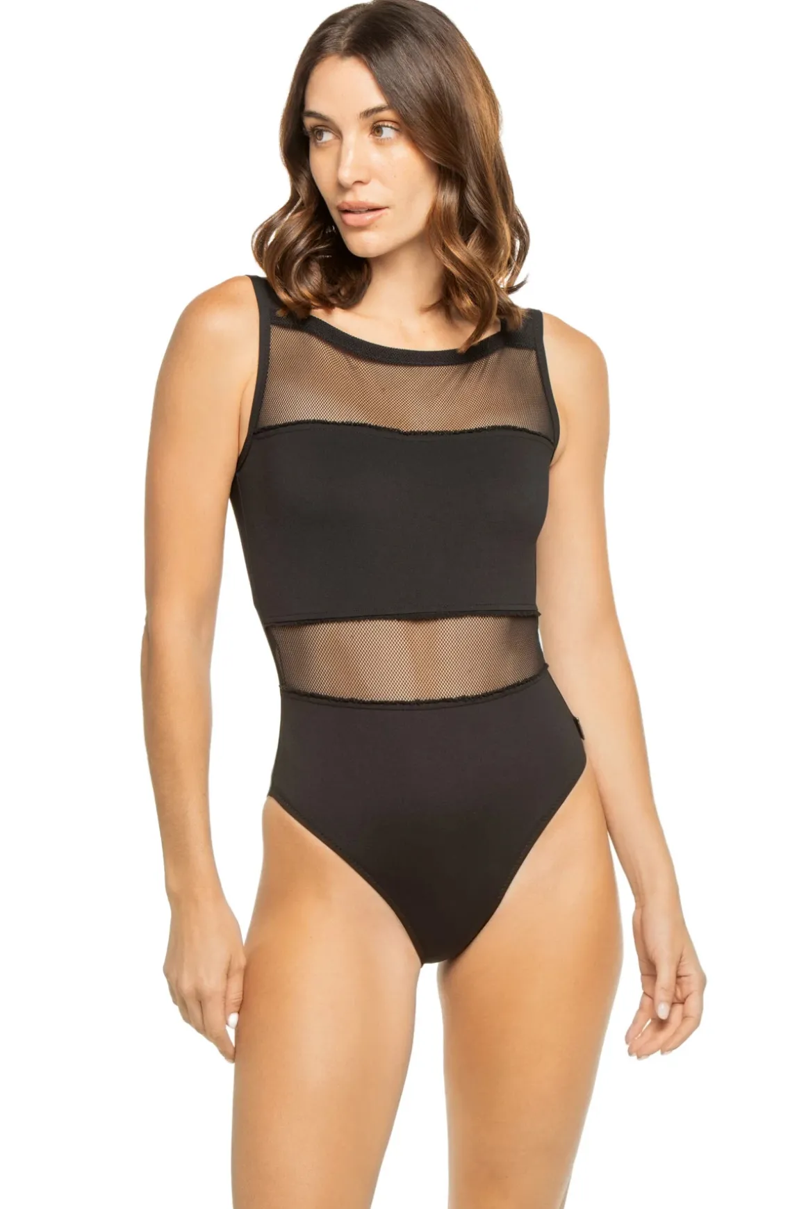 Charlie one piece features mesh insets,high neckline, and cheeky bottom coverage.