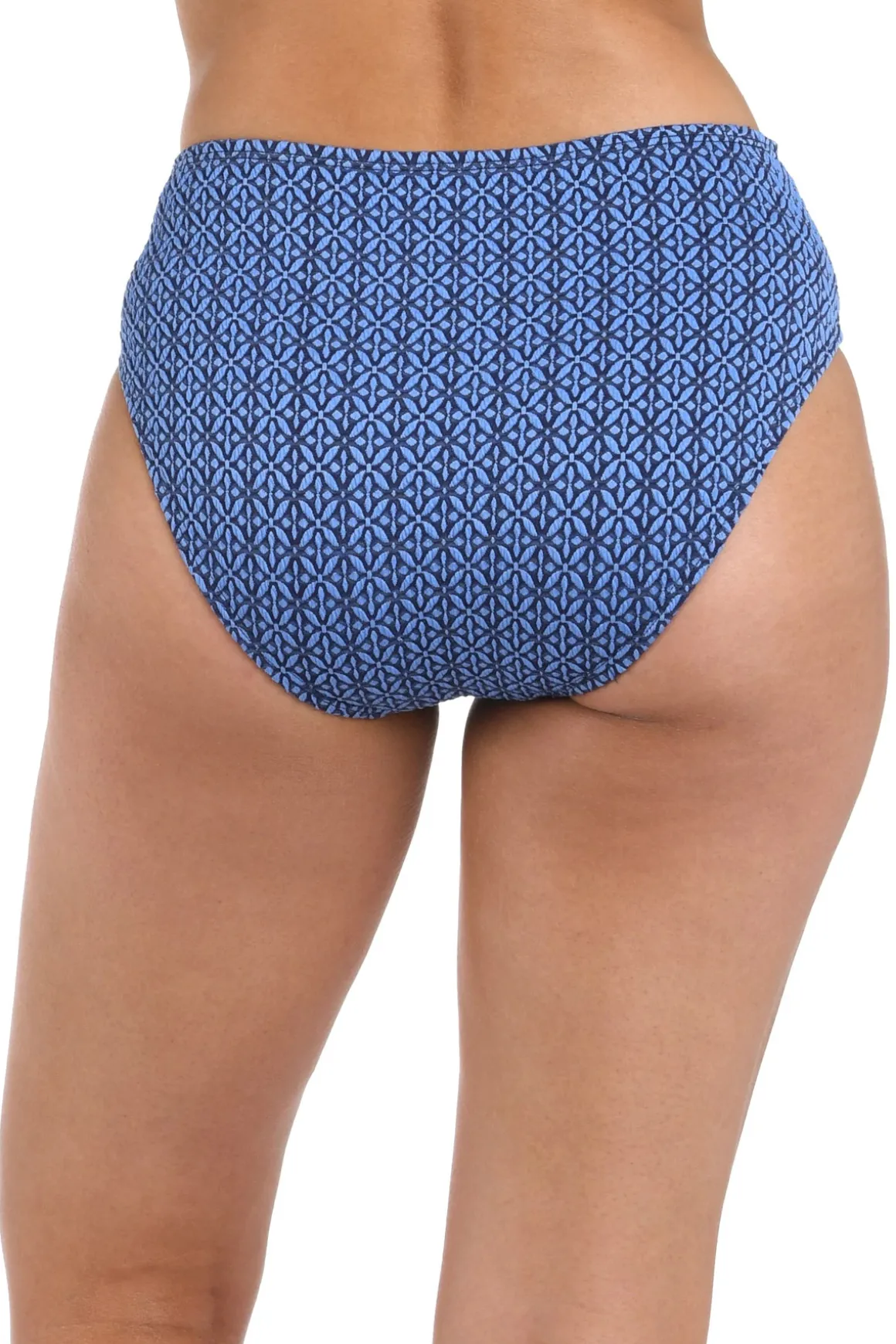 Bikini bottom features textured fabric, high waistline and offers moderate bottom coverage.