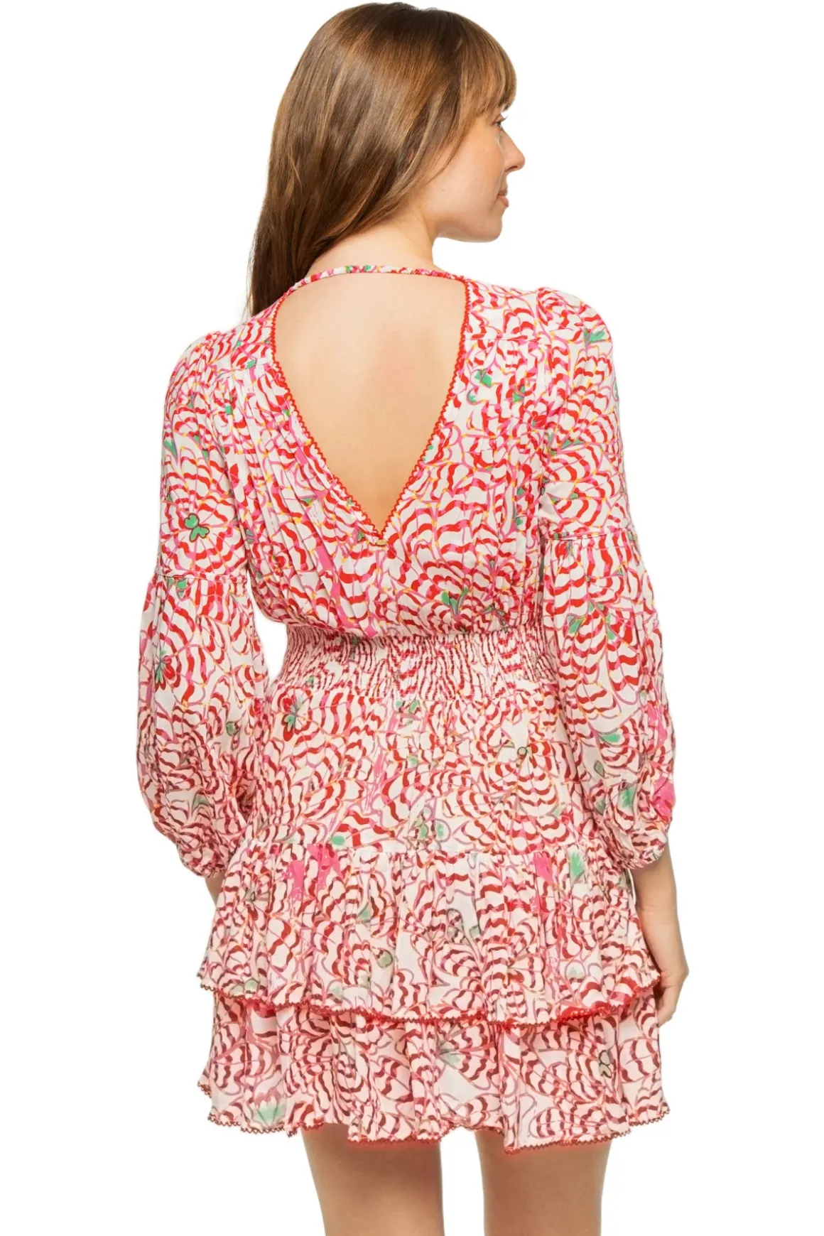 Chiara mini dress features a floral print, deep v-neckline trimmed with picot dots, pleating along the bust, waist piping details and a smocked back.Ruffle skirt is trimmed with picot-stitch trim.