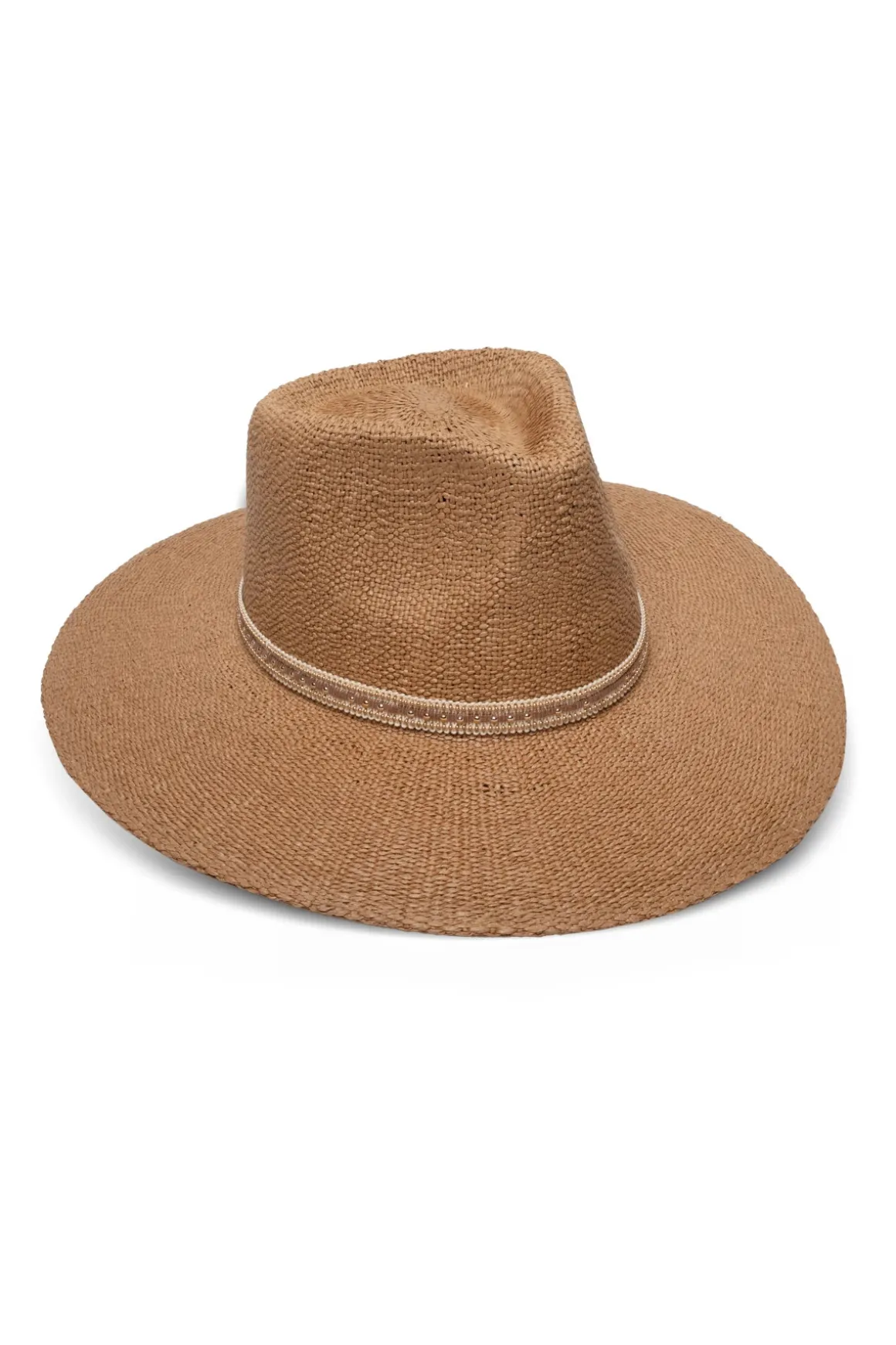 Chloe toyo fedora hat features studded trim and offers an adjustable band.