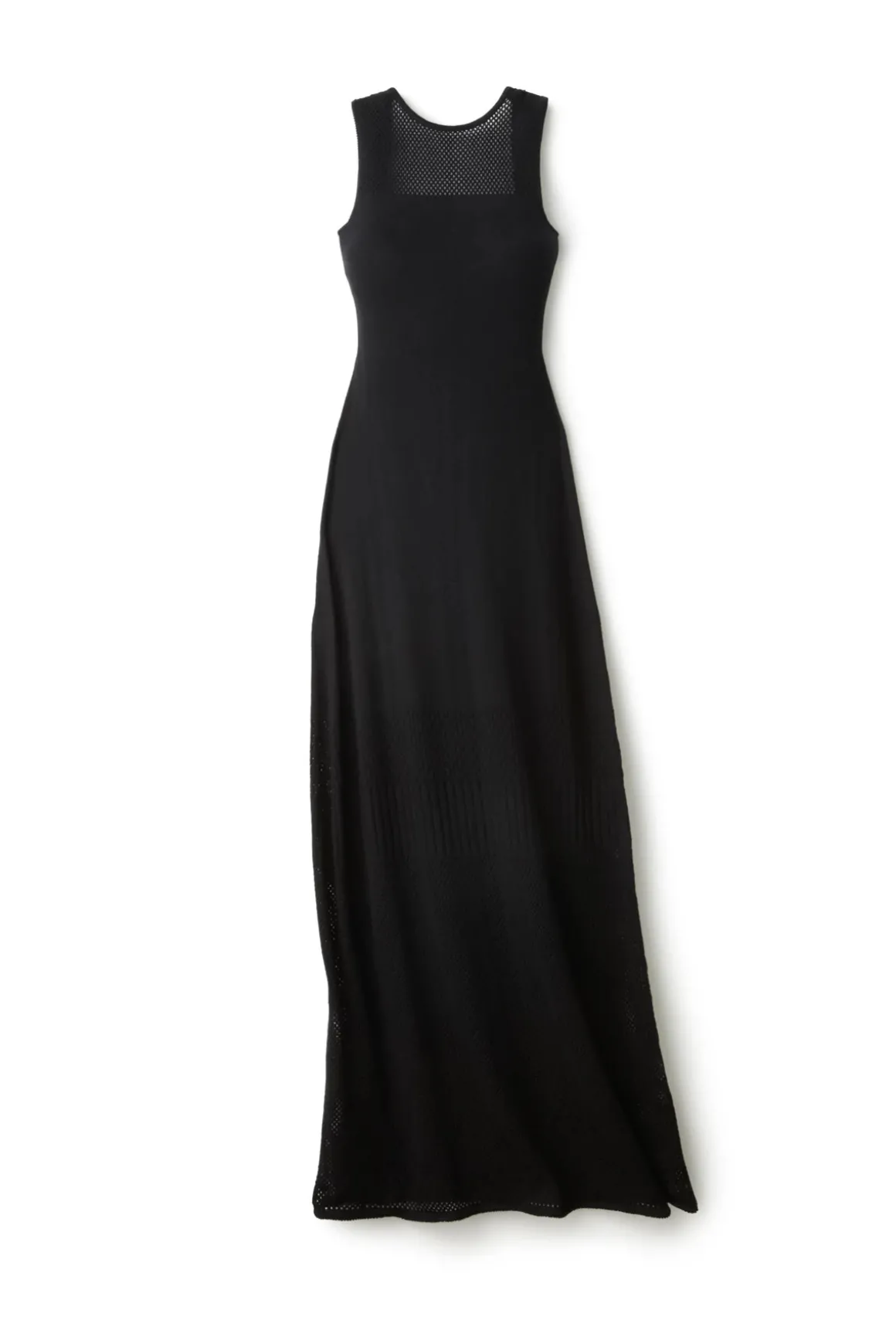 Clara maxi dress features an open weave high neck with a slim fit that offers an open back with tie closures.