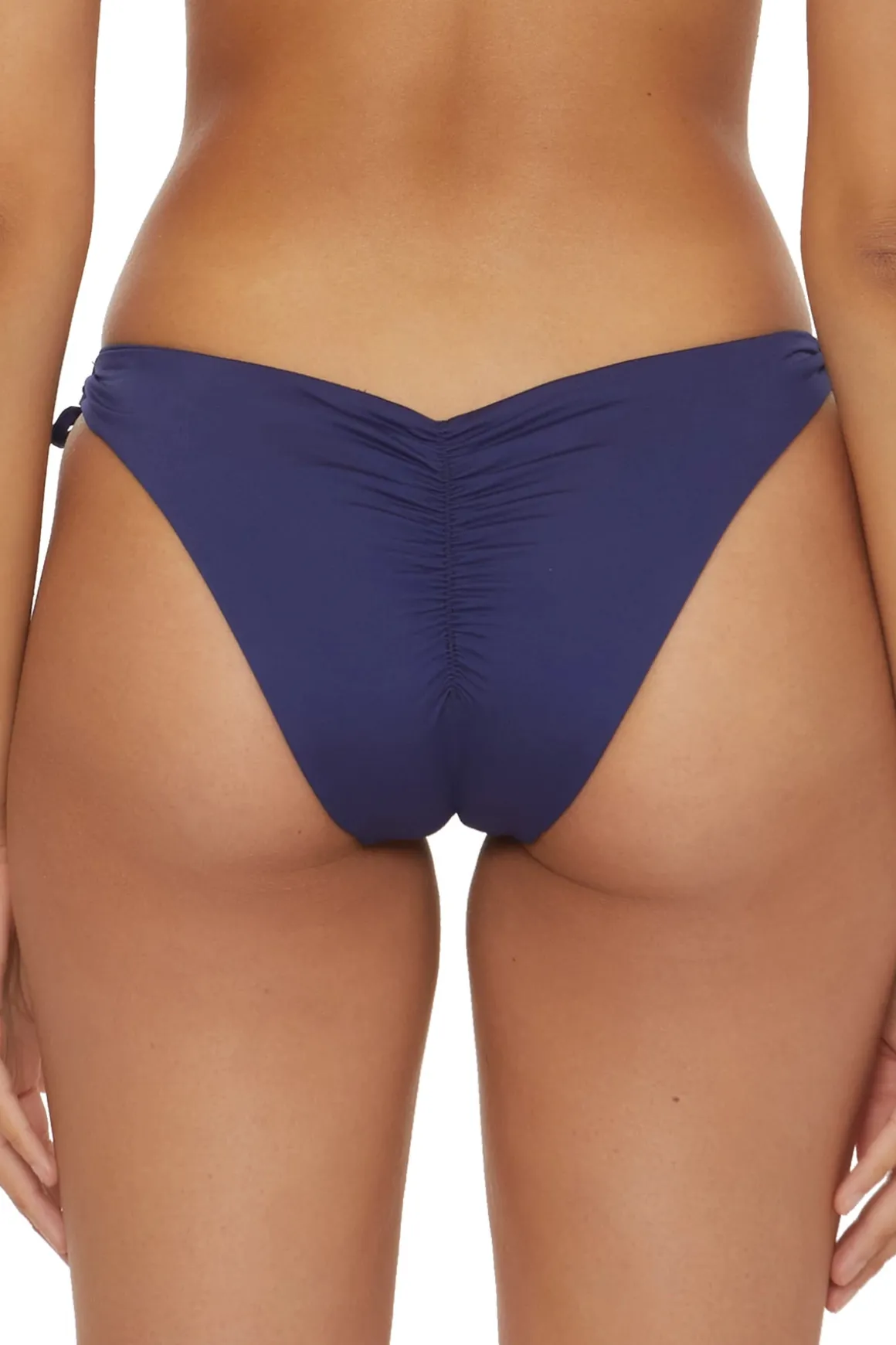 Coastal bikini bottom offers adjustable loop side ties and a skimpy shirred back.