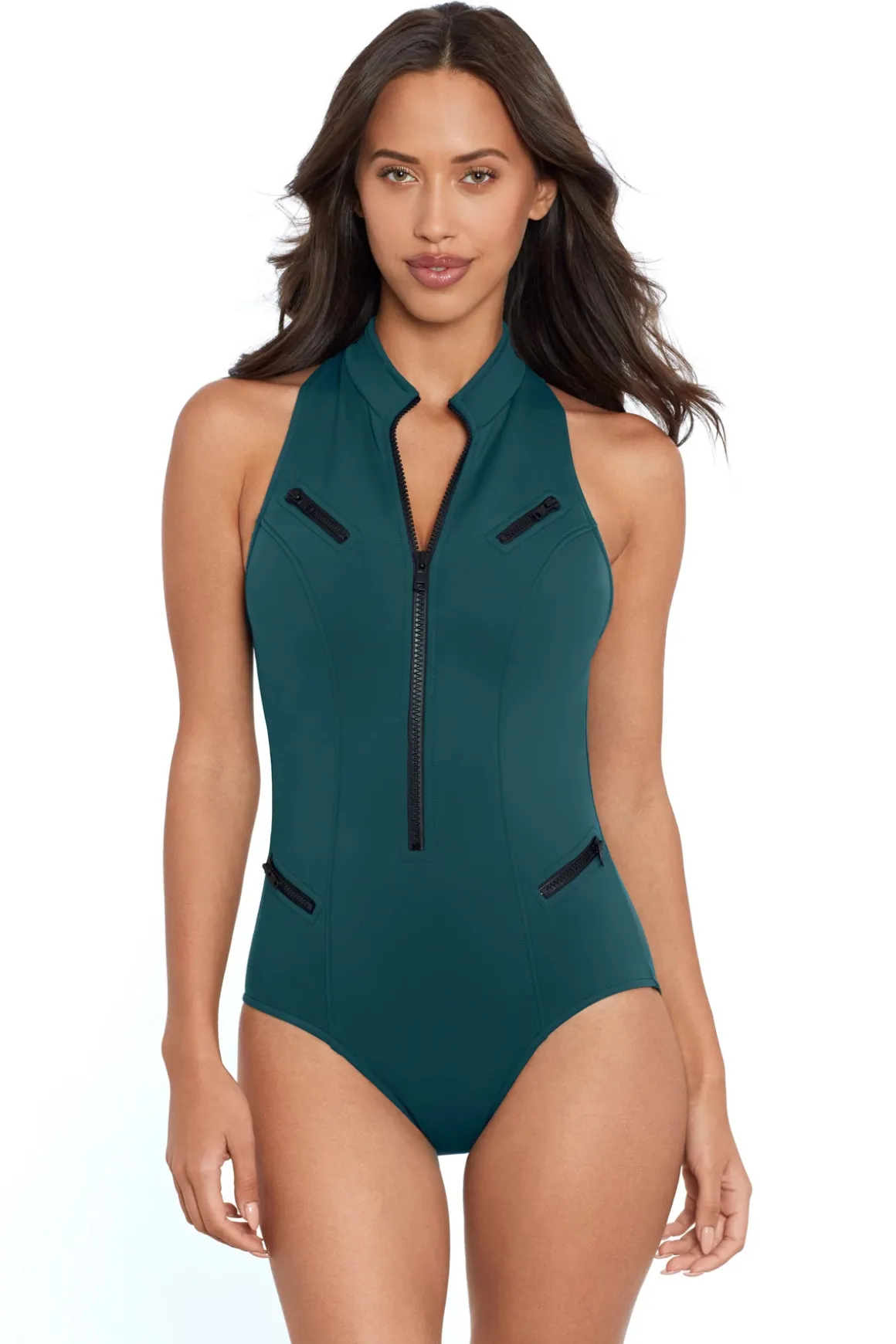 Coco one piece swimsuit features zipper front with built in underwire bra, racerback, and all over slimming effect.