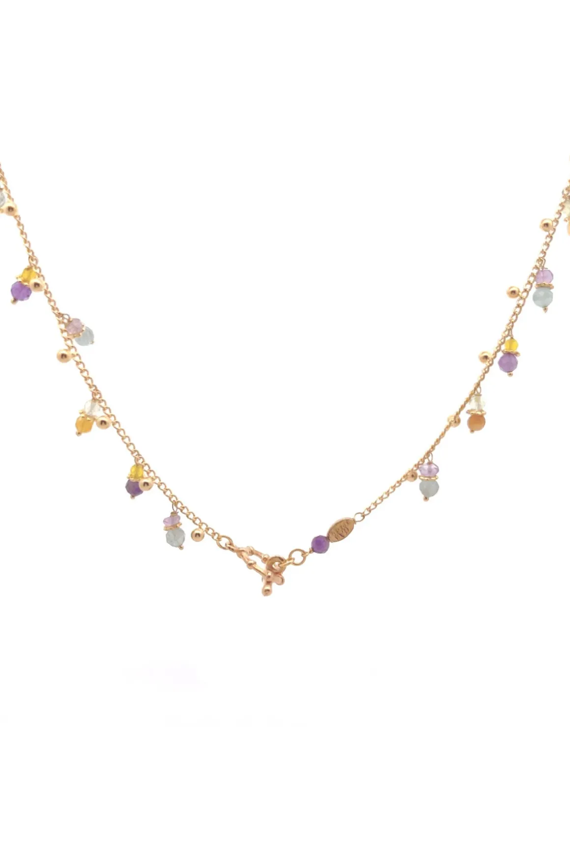 Collier tangerine necklace features 24k gold-plating adorned with semi precious stones and glass beading.