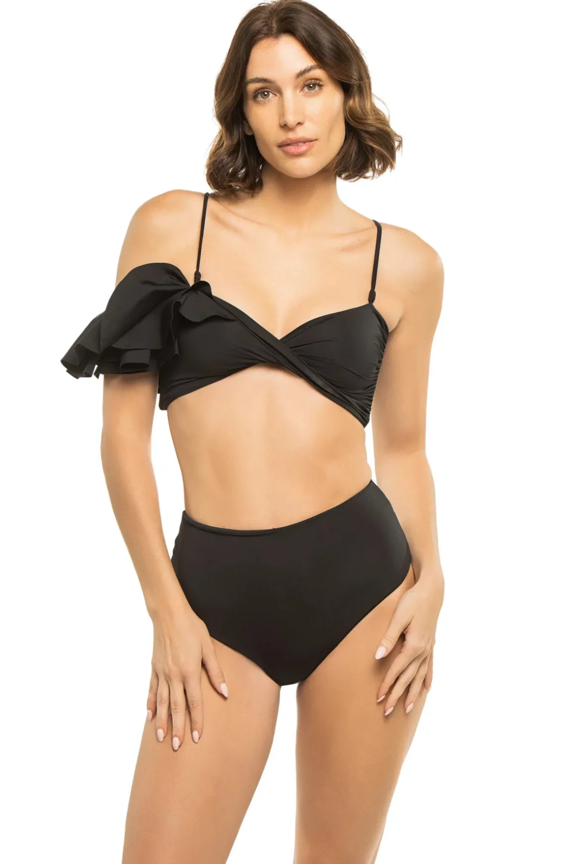 Costa bikini set features a twist front and elegant ruffle which can beworn on or off the shoulder. High-waist bottom provides moderate coverage.