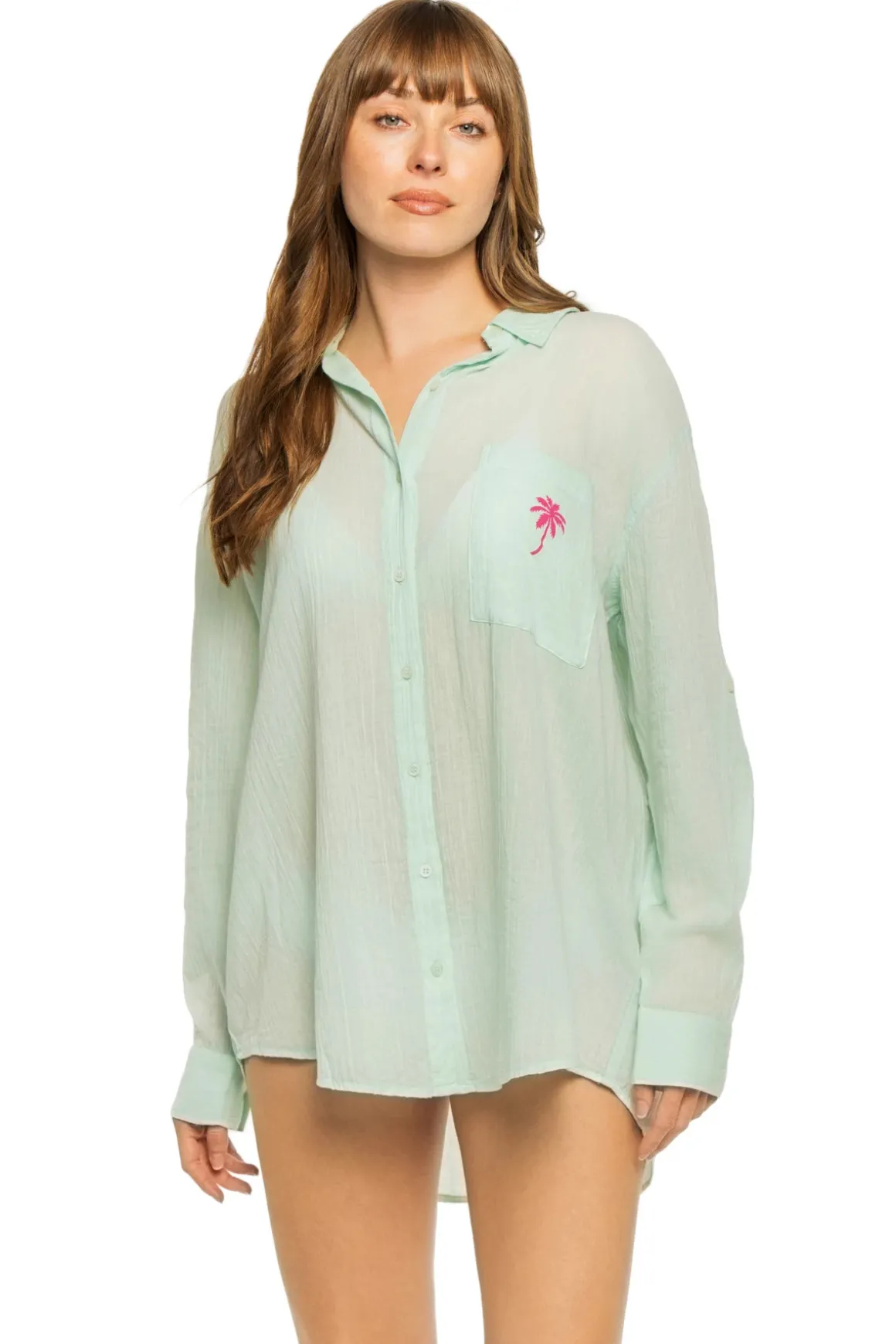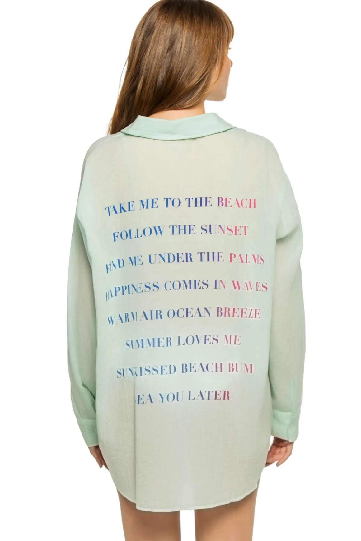 Boy shirt features cotton gauze fabric with bold script on the back and offers convertible sleeves and a button up closure.