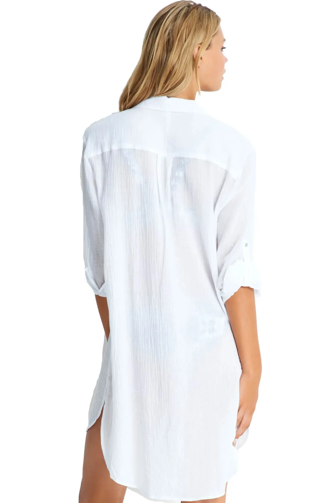 Crinkle Twill Beach Shirt dress features a collared neckline with a button down front, three-quarter cuff sleeves, front pockets and side slits.