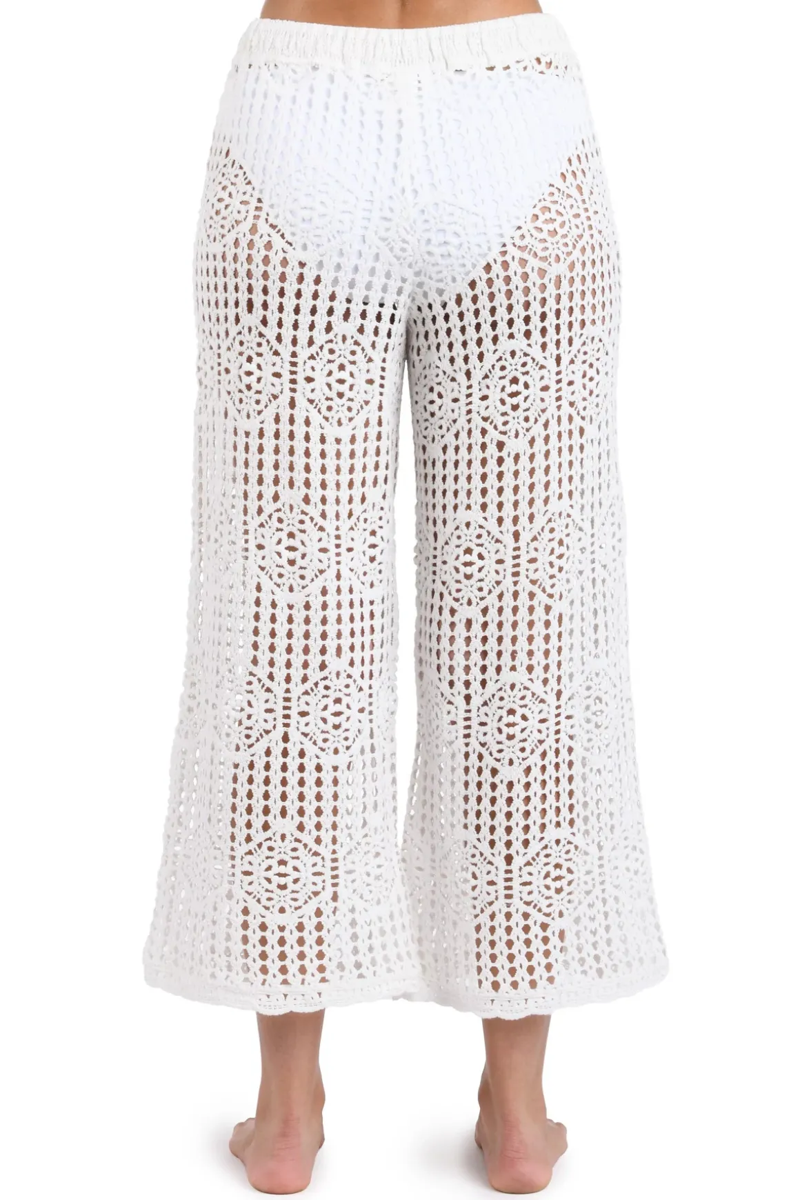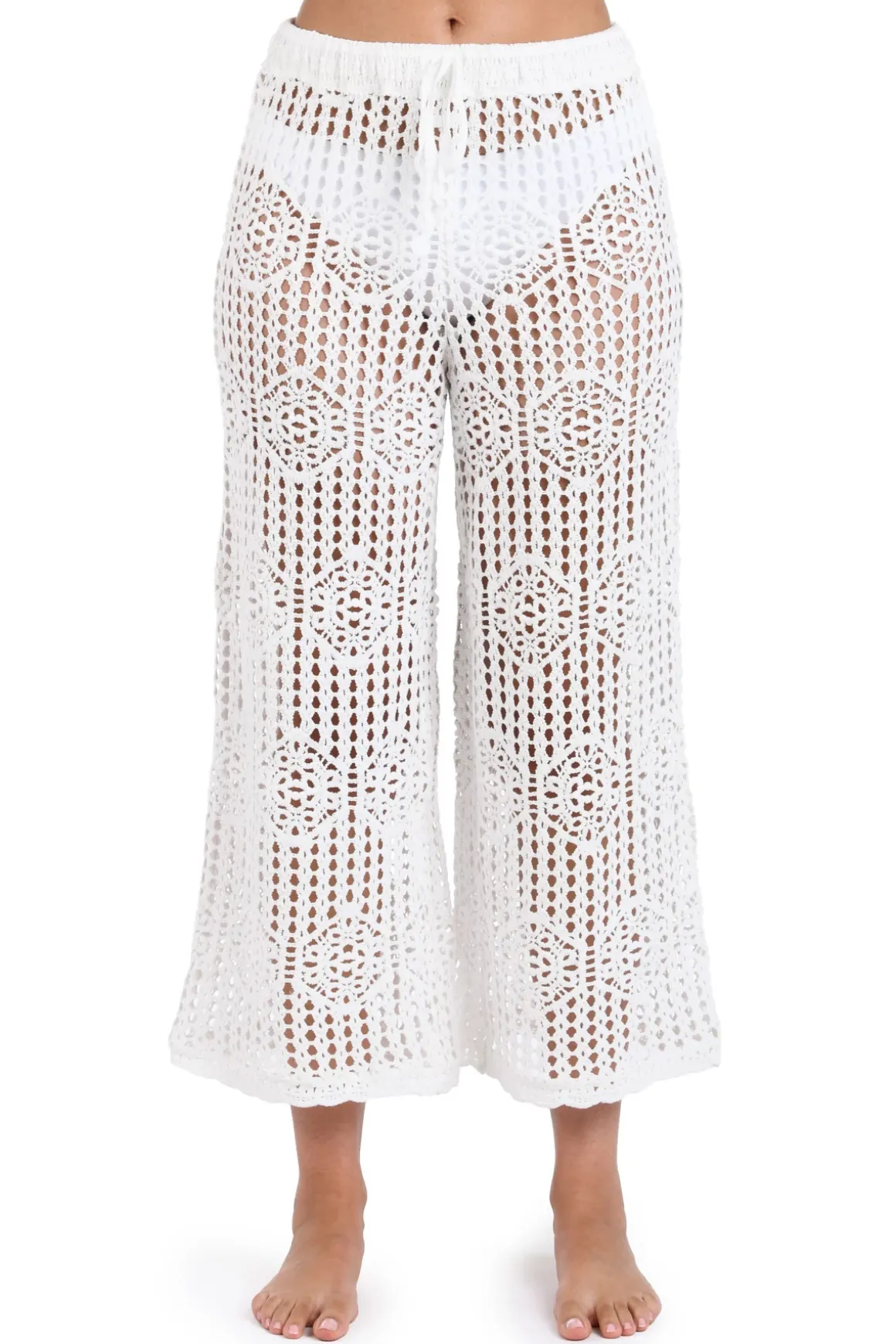 Pants feature a cropped length, crochet detail and an elastic waistband with a tie front.