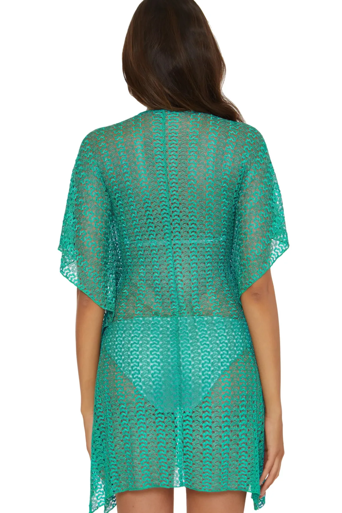 Metallic lace crochet tunic features angel wing sleeves and a drawstring empire waist.